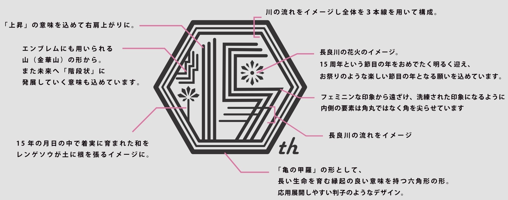 全体的に和風のテイストを土台とすることで、15年の歴史や岐阜県の歴史ある町を直観的にイメージできるロゴマークになることと、構成に要素をしぼりこみ、現代風のシンプルな造形にそろえることでこれからの未来への「新しい試み」を予感させるようなモダンなデザインにしています。