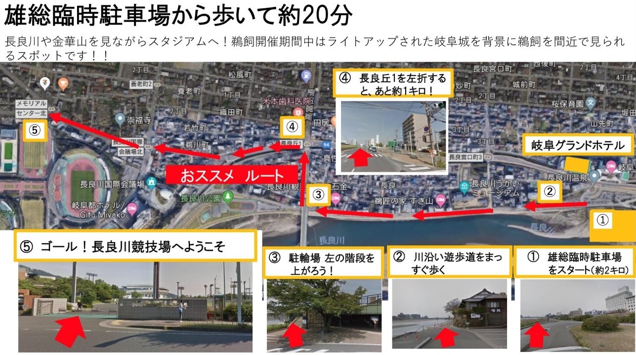 おぶさパーク(岐阜グランドホテル前河川敷)に臨時駐車場を開設し、無料のシャトルバスを運行いたします。河川敷への駐車になりますので、警備員の指示に従って、安全な運用にご協力ください。