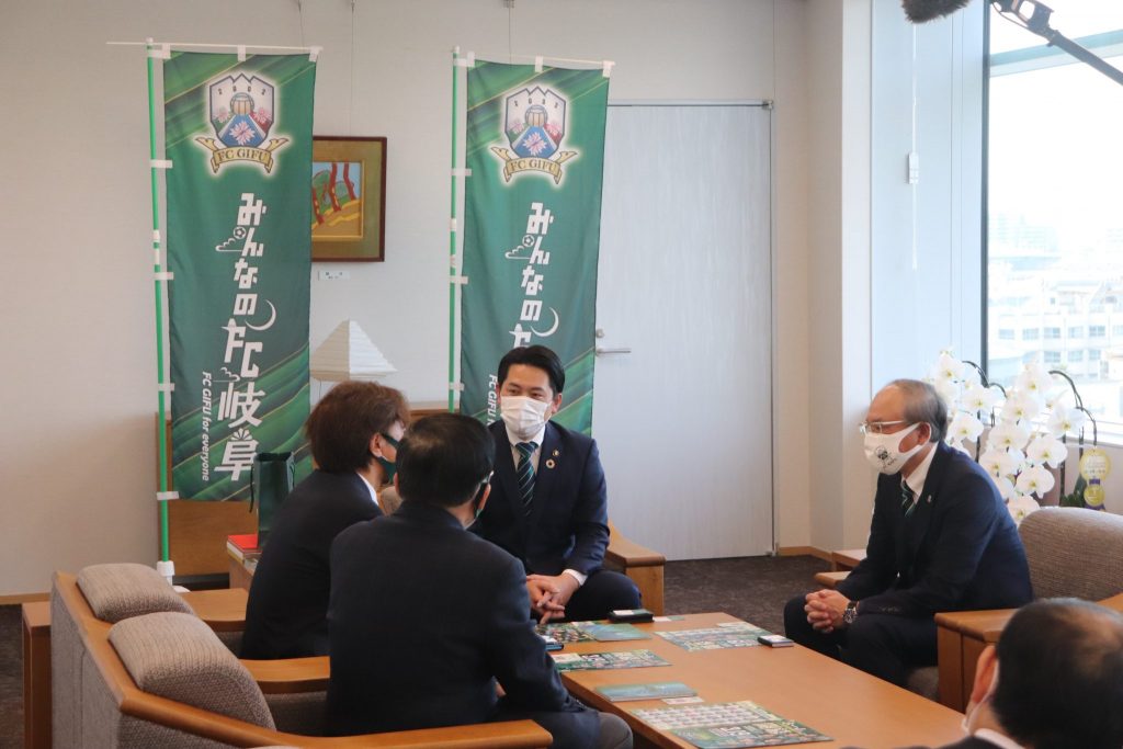 2022シーズンの開幕戦(3月12日(土)13時キックオフ Y.S.C.C.横浜戦)にあたり、3月9日(水)岐阜市役所にて、宮田博之会長、三浦俊也 監督、山道守彦 チーム統括本部長が、柴橋 正直 岐阜市長を表敬訪問させていただきました。