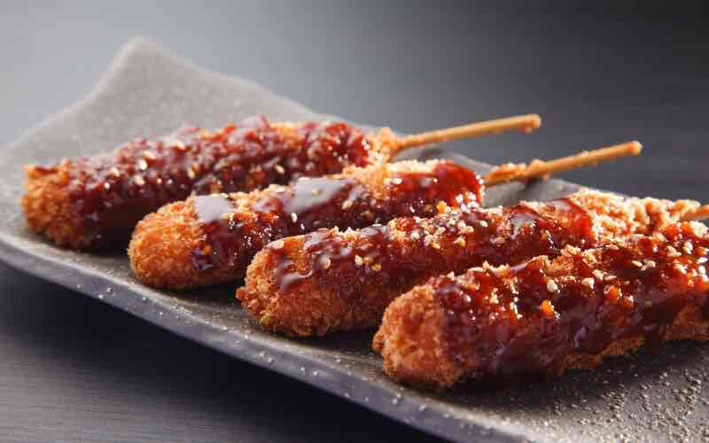 国産若鳥のサクっと串カツ、味噌又はソースで!