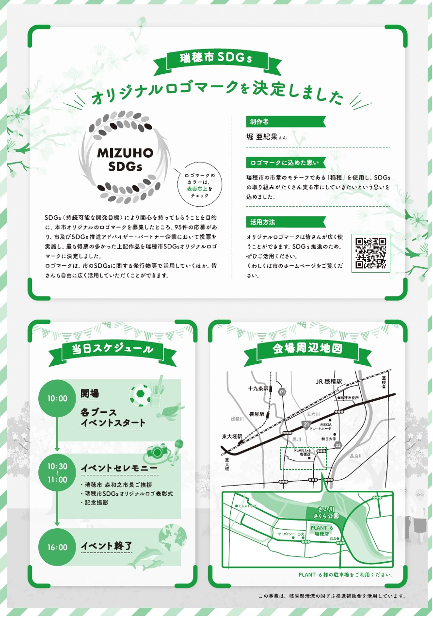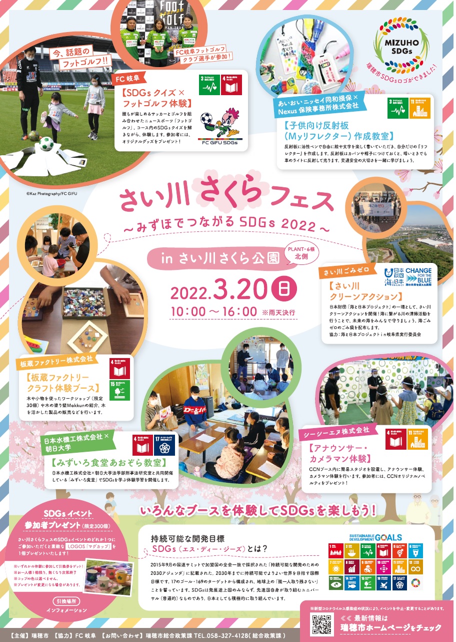 3月20日(日)瑞穂市犀川さくら公園(プラント6様北側)にて、瑞穂市「さい川さくらフェス~みずほでつながるSDGs2022~」が開催されます。