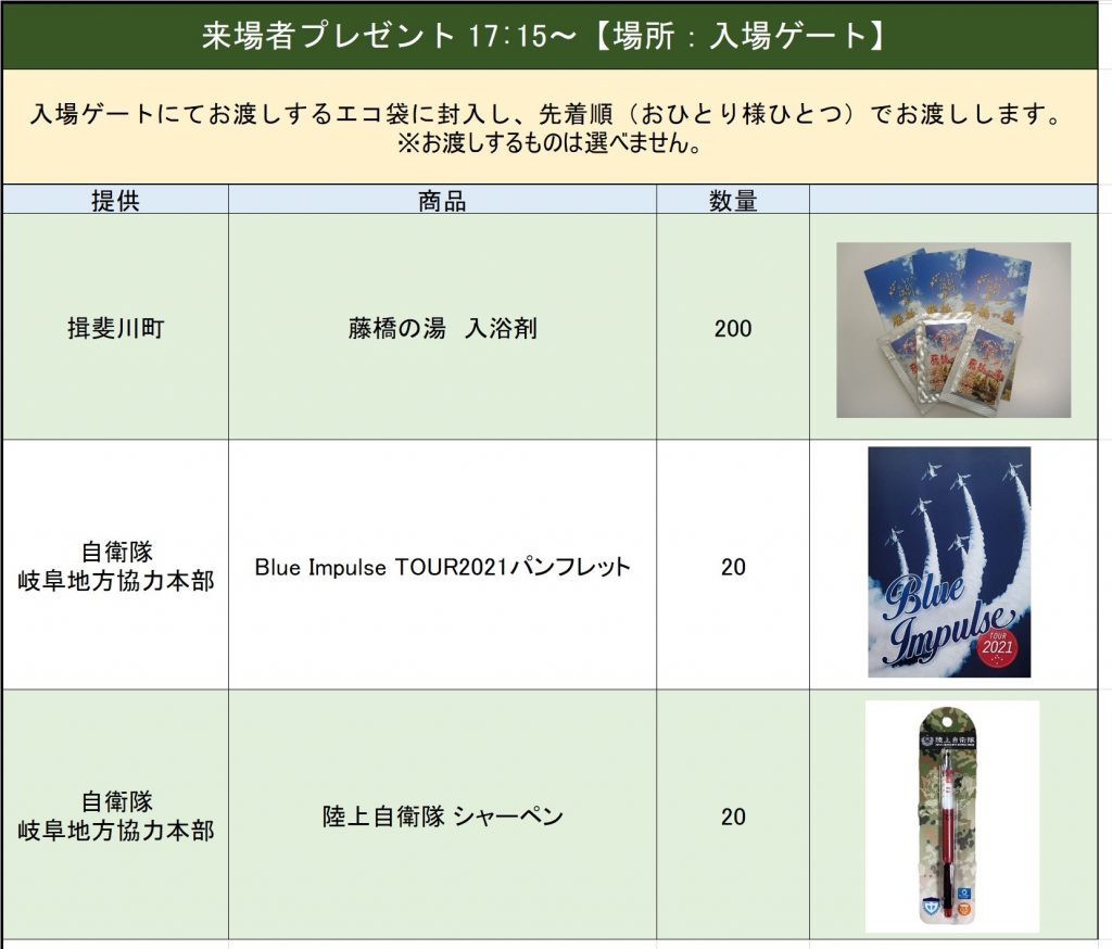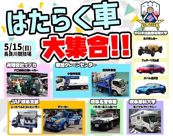 ※新型コロナウイルス感染状況によりイベント内容等が中止・変更となる場合がありますので、予めご了承ください。 先行入場/17:15~ ※当日は陸上併催のため、通常と入場時間が変わっております。お気を付けください。 【ホームチーム横断幕設置時間】 16:30~17:00 19:03キックオフ スタジアムへ来場される際に映像を参考にしていただくなどぜひご活用ください。 ※試合当日になりましたらご覧いただけます。 ★FC岐阜応援隊 『SKE48』来場 FC岐阜応援隊の『SKE48』から隊長の北野瑠華さん、青木詩織さん、荒井優希さん、福士奈央さんが来場し、スタジアムを華やかに盛り上げます! ★FC岐阜から揚げ祭り 16:00~ 【場所:芝生広場東】 FC岐阜屋台村から8種類のから揚げが大集結! “おすすめ商品”や”当日限定商品”など対象商品をなんと300円でお楽しみいただけます! たくさん食べてお気に入りを見つけよう! こどもの日 こどもたちが楽しめるイベントが盛り沢山!スタジアムで色んな体験をしよう! ★はたらく車大集合! 16:00~ 【場所:芝生広場東】 スタジアムにはたらく車が大集合!乗車体験や記念写真で楽しもう! ★スタジアムでお仕事体験! 【場所:スタジアム】 スタジアムで色んなお仕事を体験をしてみよう! ◆トイドローン体験 協力:那加クレーンセンター 16:00~ 【場所:芝生広場東】 ◆キッズメカニック体験 協力:中日本自動車短期大学 16:00~ 【場所:芝生広場東】 ◆DJ体験 協力:yacco 16:00~ 【場所:芝生広場東】 ◆子ども安全免許証発行 協力:JAF岐阜支部 16:00~ 【場所:芝生広場東】 ※事前申込終了 ★神野大地選手ランニングクリニック&教室 15:30~ 【場所:芝生広場南側】 現役プロランナー神野大地選手によるランニングクリニックを開催します。 ■大人向けランニングクリニック 15:30~ ■子ども向けランニング教室 16:30~ ■ランニング教室50mタイム測定会 ハーフタイム ※事前申込終了 当日の来場者様プレゼントとして用意していた「選手サイン色紙」を、プレイヤーズコレクションのチケットをお買い求めいただいたお客様を対象に、ホームゲームにてお渡しします。 ※今回の試合でプレイヤーズコレクション「選手サイン色紙」のお渡しを終了とさせていただきます。 ★【ファンクラブ会員対象】Jリーグ加盟15周年企画!来場して歴代ファンクラブ特典をもらおう! 16:00~ 【場所:ファンクラブブース】 5月~7月のホームゲームにおいて、ファンクラブ来場キャンペーンを実施します。 ファンクラブ会員が1試合来場につき、1個スタンプを押印します。情報カードの裏面をスタンプカードとして使用します。忘れずにお持ちください。 試合当日入会でもご参加いただけます。 ■プレゼント内容 ☆2回来場 /どちらか1つプレゼント! ・ギッフィー巾着&ミラー ・チケットホルダー ☆4回来場 /どれか1つプレゼント! ・シューズケース ・トートバック ・エコバック ※無くなり次第終了 ※プレゼント内容は途中で変更となることがあります。 ■対象試合 5月15日(日)相模原戦 18日(水)鳥取戦 ■スタンプ押印場所/時間 ファンクラブブース/キックオフ3時間前 ~ キックオフまで ※試合によって実施時間が異なる場合がございます。 ■備考 ※参加は会員ご本人様に限ります。代理の方によるスタンプの収集はできません。 ※情報カードを忘れた場合はご参加いただけませんので予めご了承ください。 ※情報カードを紛失した場合は、手数料500円で再発行できます。以前に貯めていただいたスタンプは無効となります。 ※プレゼント内容やキャンペーン内容は変更となる場合があります。