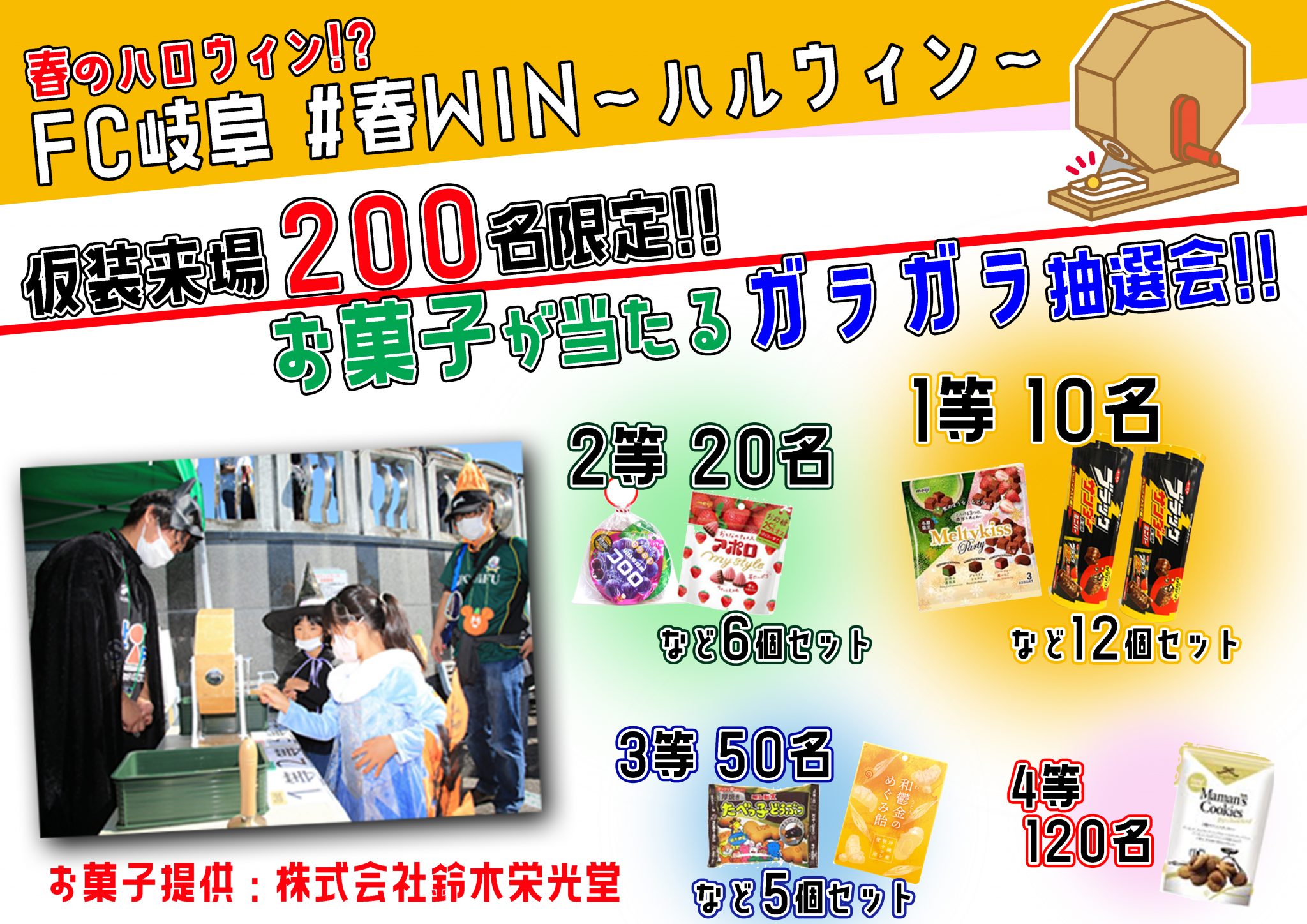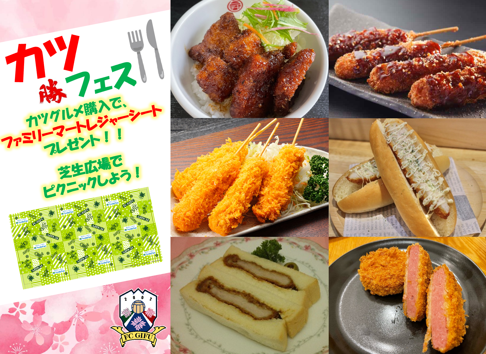 ■先行入場/16:30~ お出迎え/伊藤寧々さん・ギッフィー 15:30~16:10 19:03キックオフ スタジアムへ来場される際に映像を参考にしていただくなどぜひご活用ください。 ※試合当日になりましたらご覧いただけます。 FC岐阜 #春WIN(ハルウィン) ★カツ(勝)フェス 16:00~【場所:屋台村】 FC岐阜屋台村にカツ(勝)グルメが登場! 対象メニュー購入でファミリーマートレジャーシートをプレゼント。 ★カツ(勝)フェス 16:00~23:59【場所:ファミリーマート岐阜金華橋通り店、岐阜長良橋西店】 ファミリーマート対象店舗でも勝(カツ)フェス開催! ★【仮装来場者限定】お菓子プレゼント 協力:鈴木栄光堂 16:00~【場所:芝生広場】 仮装来場者限定で、お菓子がらがらに参加できます!(先着200名様) ★【仮装来場者限定】ハルウィンパレード ハーフタイム【場所:スタジアム】 仮装来場者限定(先着100名)で、ハーフタイムにパレードを実施します!GGG、ギッフィーも参加します! ★ギッフィー・GGG仮装 ギッフィー・GGGも仮装してFC岐阜ハルウィンを盛り上げます。 ★FC岐阜応援マネージャー 『伊藤寧々さん』来場 FC岐阜応援マネージャーの伊藤寧々さんが来場し、FC岐阜の魅力をお伝えします! ★【ファンクラブ会員対象】Jリーグ加盟15周年企画!来場して歴代ファンクラブ特典をもらおう! 16:00~ 【場所:ファンクラブブース】 5月~7月のホームゲームにおいて、ファンクラブ来場キャンペーンを実施します。 ファンクラブ会員が1試合来場につき、1個スタンプを押印します。情報カードの裏面をスタンプカードとして使用します。忘れずにお持ちください。 試合当日入会でもご参加いただけます。 ■プレゼント内容 ☆2回来場 /どちらか1つプレゼント! ・ギッフィー巾着&ミラー ・チケットホルダー ☆4回来場 /どれか1つプレゼント! ・シューズケース ・トートバック ・エコバック ※無くなり次第終了 ※プレゼント内容は途中で変更となることがあります。 ■対象試合 5月15日(日)相模原戦 18日(水)鳥取戦 ■スタンプ押印場所/時間 ファンクラブブース/キックオフ3時間前 ~ キックオフまで ※試合によって実施時間が異なる場合がございます。 ■備考 ※参加は会員ご本人様に限ります。代理の方によるスタンプの収集はできません。 ※情報カードを忘れた場合はご参加いただけませんので予めご了承ください。 ※情報カードを紛失した場合は、手数料500円で再発行できます。以前に貯めていただいたスタンプは無効となります。 ※プレゼント内容やキャンペーン内容は変更となる場合があります。