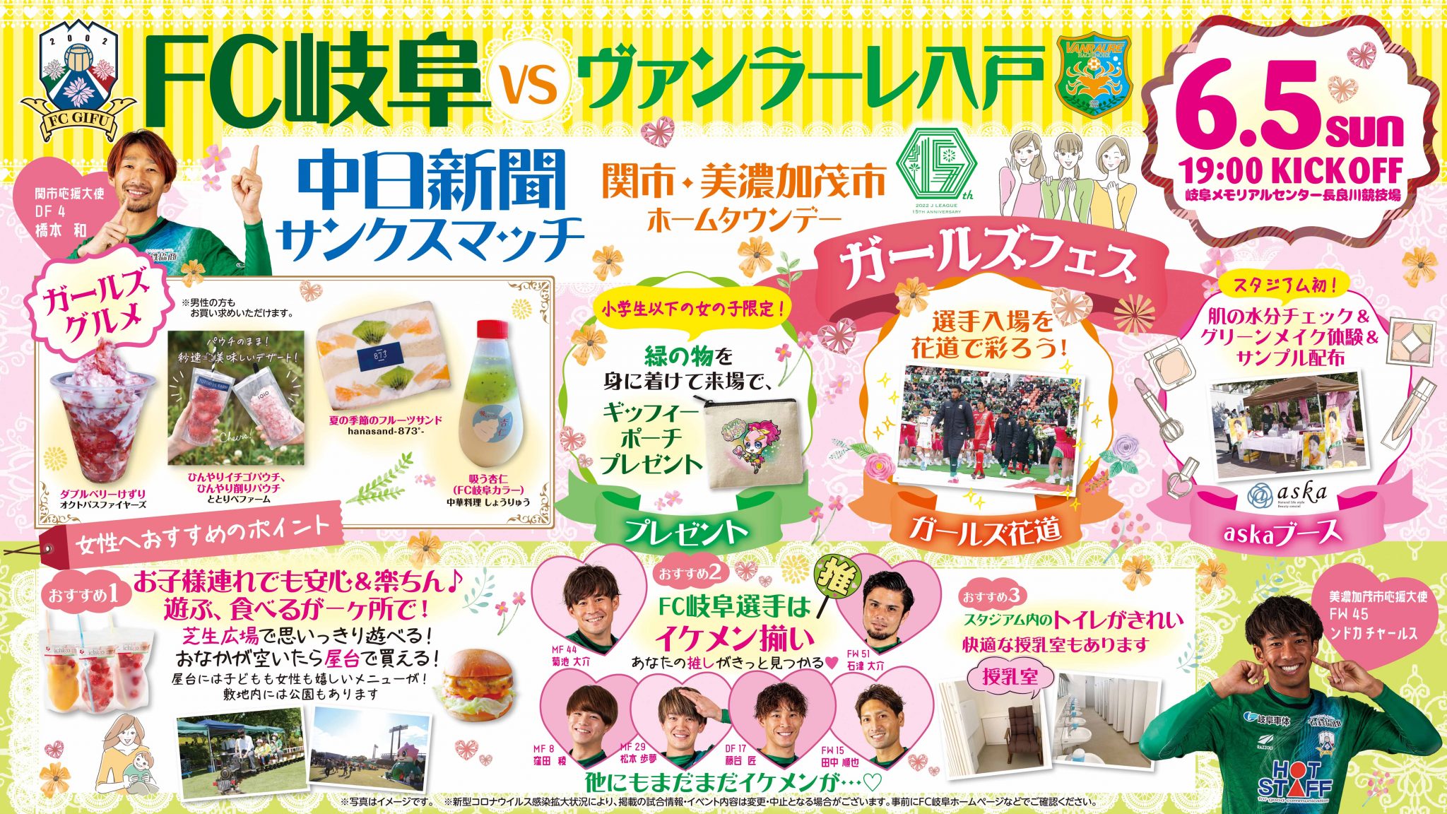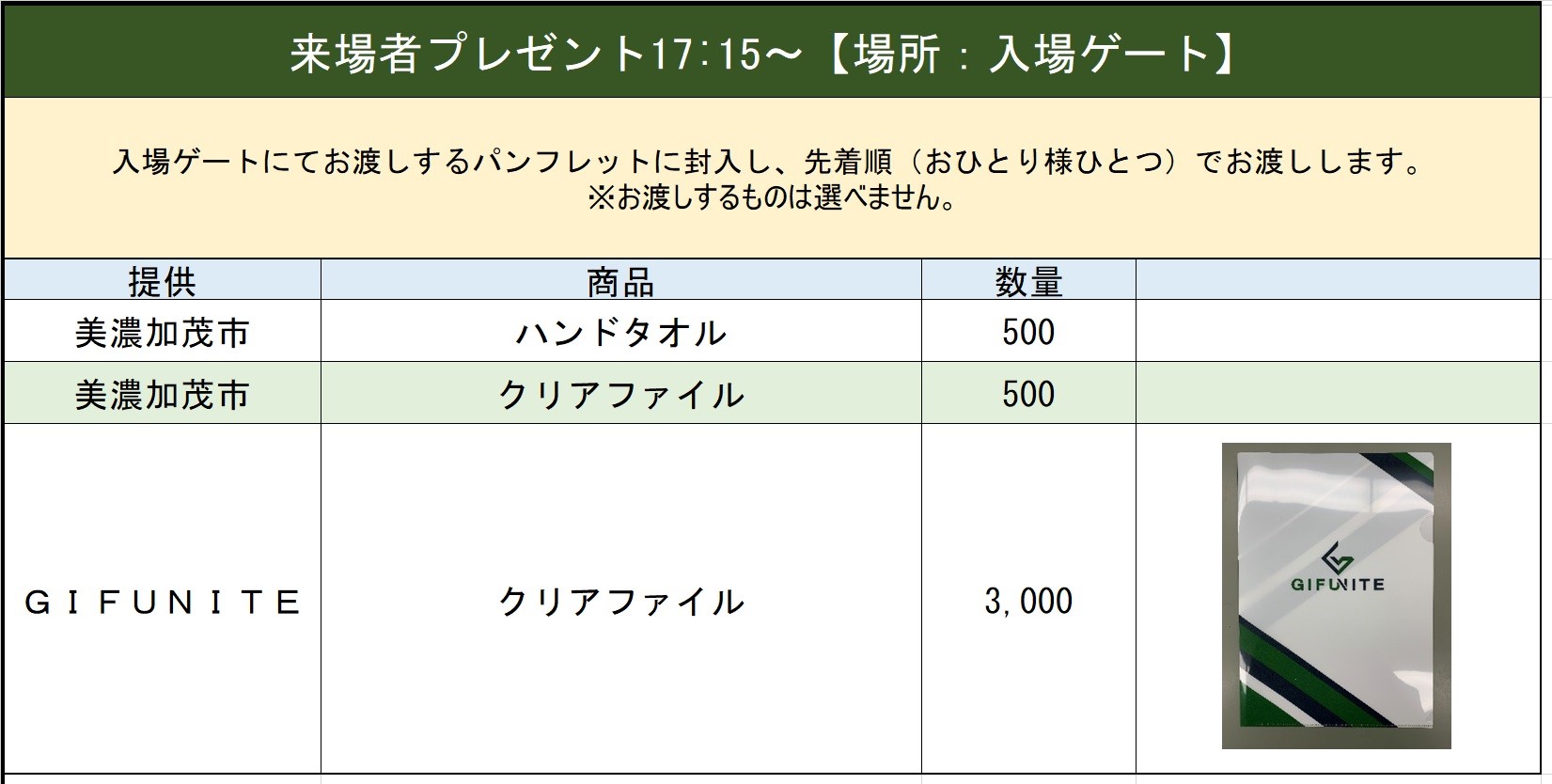 先行入場/17:15~ ※当日は陸上併催のため、通常と入場時間が変わっております。お気を付けください。 【ホームチーム横断幕設置時間】 16:30~17:00 19:03キックオフ スタジアムへ来場される際に映像を参考にしていただくなどぜひご活用ください。 ※試合当日になりましたらご覧いただけます。 ★FC岐阜応援隊 『SKE48』来場 FC岐阜応援隊の『SKE48』から隊長の北野瑠華さん、相川暖花さん、井田玲音名さん、谷真理佳さんが来場し、スタジアムを華やかに盛り上げます! ガールズフェス ナガラジェンヌ(FC岐阜女性サポーター)に楽しんでいただけるイベントが盛り沢山です。 ★ガールズグルメ 16:00~ 【場所:芝生広場東】 初夏の旬な果物を使用したスイーツグルメが登場! ◆ダブルベリーけずり/オクトパスファイヤーズ 価格:500円 ◆ひんやりイチゴパウチ、ひんやり削りパウチ/ととりべファーム 価格:各500円 ◆吸う杏仁(FC岐阜カラー)/中華料理 しょうりゅう 価格:500円 「吸い~つ」を吸ってFC岐阜を応援しよう! ★化粧品専門店askaブース 16:00~ 【場所:芝生広場東】 グリーンアイメイクを実施します。※セルフ体験ブースです 水分チェックチェレンジ(18歳以上限定)で水分量が46%以上の方には、FC岐阜選手サイン入りハンドタオルをプレゼントします! ★ギッフィーポーチプレゼント 16:00~ 【場所:芝生広場】 緑のものを身に着けて来場された小学生以下の女の子にギッフィーポーチをプレゼント! ★ガールズ花道 18:57~ 【場所:芝生広場東】 選手入場を華やかに盛り上げよう!ナガラジェンヌによるガールズ花道を実施します。 ★【ファンクラブ会員対象】Jリーグ加盟15周年企画!来場して歴代ファンクラブ特典をもらおう! 16:00~ 【場所:ファンクラブブース】 5月~7月のホームゲームにおいて、ファンクラブ来場キャンペーンを実施します。 ファンクラブ会員が1試合来場につき、1個スタンプを押印します。情報カードの裏面をスタンプカードとして使用します。忘れずにお持ちください。 試合当日入会でもご参加いただけます。 ■プレゼント内容 ☆2回来場 /どちらか1つプレゼント! ・ギッフィー巾着&ミラー ・チケットホルダー ☆4回来場 /どれか1つプレゼント! ・シューズケース ・トートバック ・エコバック ※無くなり次第終了 ※プレゼント内容は途中で変更となることがあります。 ■対象試合 5月15日(日)相模原戦 18日(水)鳥取戦 ■スタンプ押印場所/時間 ファンクラブブース/キックオフ3時間前 ~ キックオフまで ※試合によって実施時間が異なる場合がございます。 ■備考 ※参加は会員ご本人様に限ります。代理の方によるスタンプの収集はできません。 ※情報カードを忘れた場合はご参加いただけませんので予めご了承ください。 ※情報カードを紛失した場合は、手数料500円で再発行できます。以前に貯めていただいたスタンプは無効となります。 ※プレゼント内容やキャンペーン内容は変更となる場合があります。