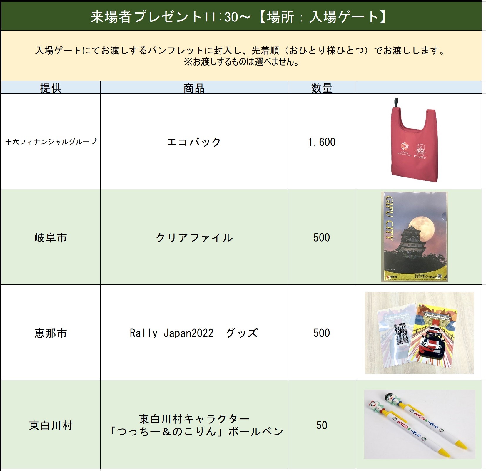 先行入場/11:30~ 【ホームチーム横断幕設置時間】 10:30~11:10 14:03キックオフ スタジアムへ来場される際に映像を参考にしていただくなどぜひご活用ください。 ※試合当日になりましたらご覧いただけます。 ★岐阜市民無料招待 好評により、申込上限に達しましたので募集を終了しました。 ※当日は申込者全員の岐阜市内在住と確認できるものをご提示下さい。(免許証・住民票・保険証など) ※無料招待チケットの当日受付はありません。 ≪招待チケットお渡し場所≫ ★岐阜市民招待チケット入場者限定Tシャツ・手ぬぐいプレゼント 岐阜市ホームタウンデー開催記念として岐阜市民招待チケット入場者限定でTシャツ&手ぬぐいをプレゼント! ※Tシャツの各サイズの数量には限りがありますので、ご希望に添えない場合がございます。 ★「寺坂頼我さん」来場 岐阜県出身で、「ウルトラマントリガー NEWGENERATION TIGA」主人公マナカ ケンゴをつとめる寺坂頼我さんが来場しスタジアムを盛り上げます。 ★FC岐阜応援隊 『SKE48』来場 FC岐阜応援隊の『SKE48』から隊長の北野瑠華さん、鎌田菜月さん、鈴木恋奈さん、田辺美月さんが来場し、スタジアムを華やかに盛り上げます! ★【ファンクラブ会員対象】Jリーグ加盟15周年企画!来場して歴代ファンクラブ特典をもらおう! 11:00~ 【場所:ファンクラブブース】 5月~7月のホームゲームにおいて、ファンクラブ来場キャンペーンを実施します。 ファンクラブ会員が1試合来場につき、1個スタンプを押印します。情報カードの裏面をスタンプカードとして使用します。忘れずにお持ちください。 試合当日入会でもご参加いただけます。 ■プレゼント内容 ☆2回来場 /どちらか1つプレゼント! ・ギッフィー巾着&ミラー ・チケットホルダー ☆4回来場 /どれか1つプレゼント! ・シューズケース ・トートバック ・エコバック ※無くなり次第終了 ※プレゼント内容は途中で変更となることがあります。 ■対象試合 5月15日(日)相模原戦 18日(水)鳥取戦 ■スタンプ押印場所/時間 ファンクラブブース/キックオフ3時間前 ~ キックオフまで ※試合によって実施時間が異なる場合がございます。 ■備考 ※参加は会員ご本人様に限ります。代理の方によるスタンプの収集はできません。 ※情報カードを忘れた場合はご参加いただけませんので予めご了承ください。 ※情報カードを紛失した場合は、手数料500円で再発行できます。以前に貯めていただいたスタンプは無効となります。 ※プレゼント内容やキャンペーン内容は変更となる場合があります。 ★おぶさパーク臨時駐車場設置