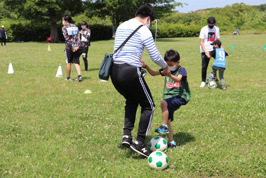 お父さんやお母さんと競争しながら、楽しくドリブルとシュートのトレーニングを行いました。