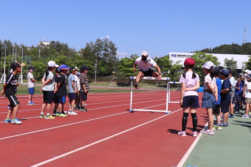 和戸選手の競技をみんなに知ってもらおう!ということで、110mハードルのデモンストレーションをしました。