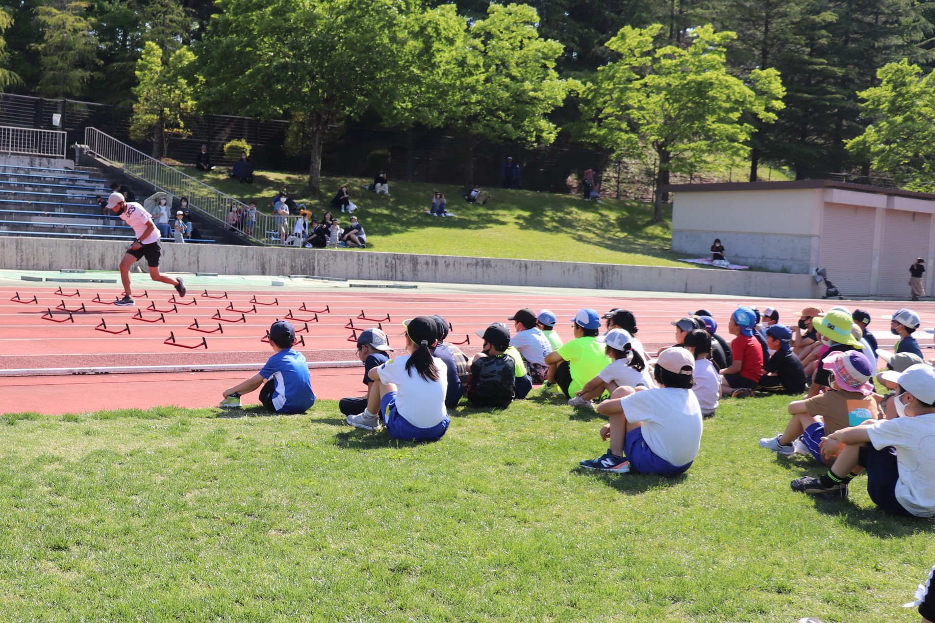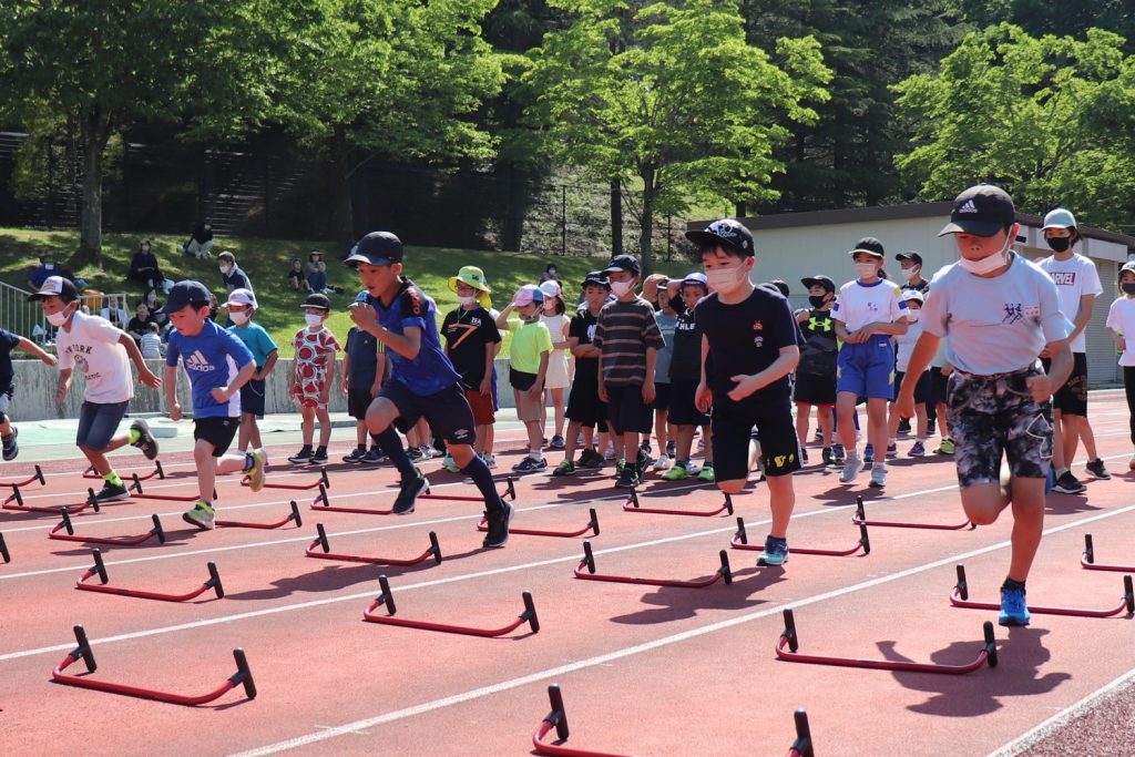 初めて見るハードルは自分達の身長や肩ほどある高さ(106.7cm)。それを軽々と跳ぶ和戸選手に「すごい!」と拍手して驚く姿がみられました。