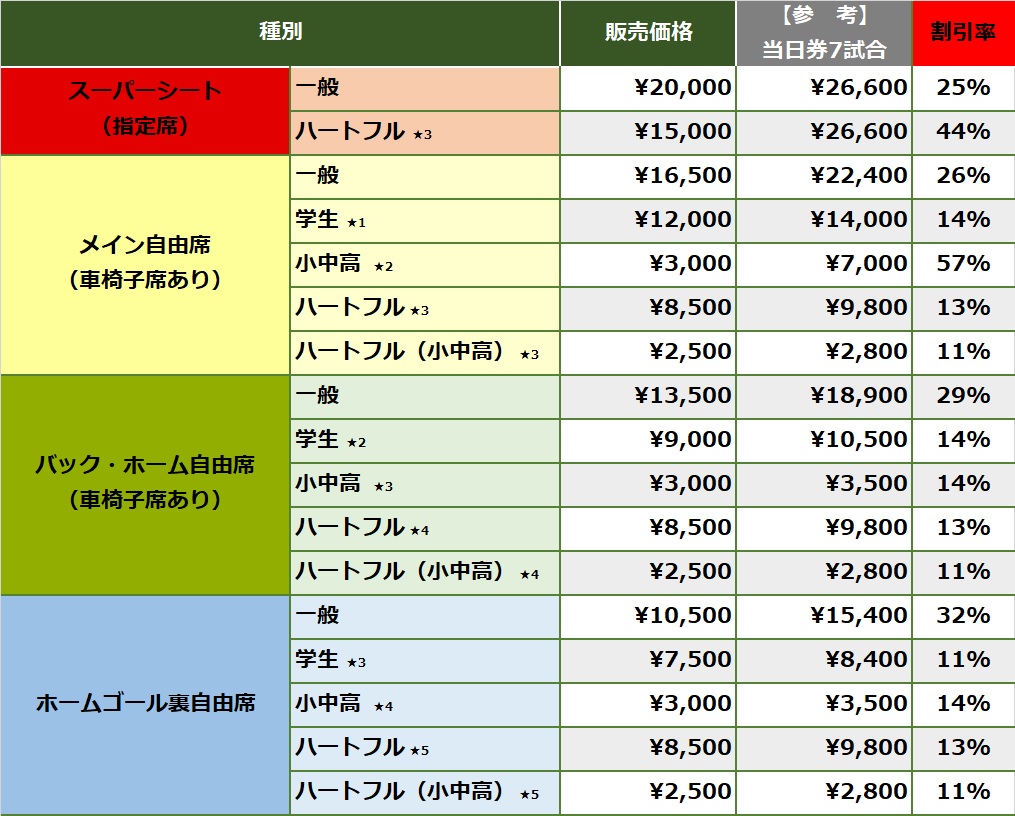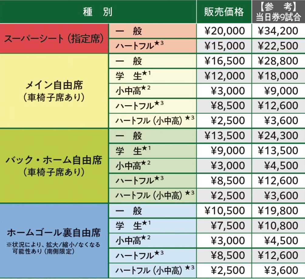 なお、試合ごとの一般チケットと並行してハーフシーズンシートの販売を行う都合により、対象試合の1試合目のみご希望の席とは別のお席をご用意する場合がございます。学生・ハートフル価格でお申し込みの場合、証明証の提出が必要です。〇席種「学生・ハートフル」を申し込みの方へ