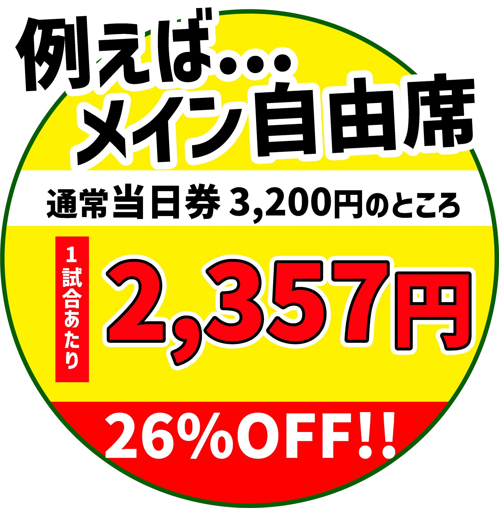例えば、メイン自由席(一般)は当日券より「26%」オフ!