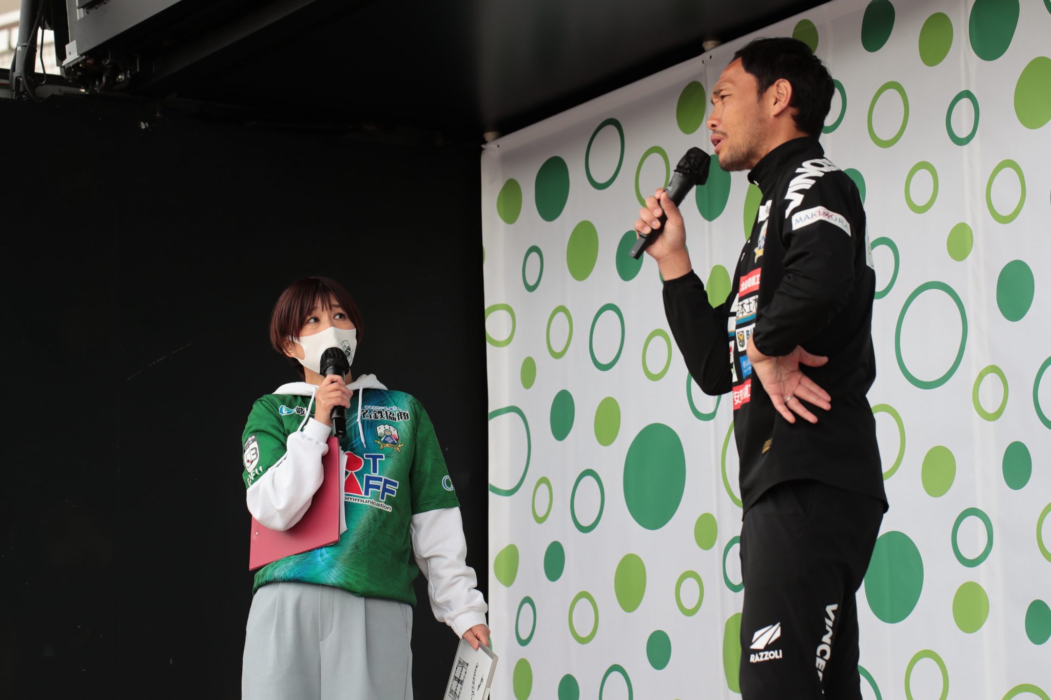 スタジアムへ来場される際に映像を参考にしていただくなどぜひご活用ください。 ※試合当日になりましたらご覧いただけます。 ★FC岐阜応援隊 『SKE48』来場 FC岐阜応援隊の『SKE48』から隊長の北野瑠華さん、副隊長の太田彩夏さん、倉島杏実さん、高畑結希さんが来場し、スタジアムを華やかに盛り上げます! 夢パスの日 夢パスキッズが楽しみるイベントが盛り沢山です。 ★【夢パスキッズ限定】アトラクションチャレンジ! 16:00~ 【場所:芝生広場】 色々なアトラクションに参加して、FC岐阜選手サイン入りシール&お菓子詰合せ巾着をゲットしよう! ★【夢パスキッズ限定】ゲートで選手サイン入りシールプレゼント! 17:15~ 【場所:入場口】 夢パスキッズ専用ゲートをくぐると、FC岐阜選手の直筆サイン入りシールをプレゼントします! ※無くなり次第終了 ★【夢パスキッズ限定】ピッチ内練習見学ツアー 18:15~18:45 【場所:スタジアム】 夢パスキッズ限定でピッチ内見学ツアーを開催します!試合前のFC岐阜の選手を間近で見よう! ※申込受付を終了しました ★【夢パスキッズ限定】夢パスキッズ花道 18:57~ 【場所:スタジアム】 選手入場を華やかに盛り上げよう!夢パスキッズによる花道を実施します。 ★【夢パスキッズ限定】ピッチ大開放 試合終了後 15分後~30分間 【場所:スタジアム】 夢パスキッズ対象!試合終了後のピッチで遊ぼう! 参 加:FC岐阜クラブアンバサダー 難波宏明、ギッフィー 脱炭素を考える日 関係団体の皆様による啓発・体験ブースの出展やウォーキングイベントなど様々な取り組みを通して、ご来場される皆様方に「脱炭素」について「知る・考える・取り組む」機会の創出を目指した催しを開催いたします。 ★脱炭素啓発・体験ブース 16:00~ 【場所:芝生広場東】 脱炭素について楽しく学べるブースが出展します。 出展団体:岐阜県 環境生活部 脱炭素社会推進課 / 岐阜市 環境部 低炭素・資源循環課 / 岐阜県地球温暖化防止活動推進センター / 国立大学法人東海国立大学機構 岐阜大学 / akippa株式会社 ★カーボンオフセットグッズ販売 16:00~ 【場所:グッズ売店】 カーボンオフセット商品の売上の一部をJAめぐみの様による「ほらどキウイを未来につなごうプロジェクト!」に寄付し、キウイの苗木の購入資金としていただきます。後日、JAめぐみの様と協同での植樹活動を予定しております。 【対象商品】 ・写真家 小林 淳 氏とのコラボタオルマフラー ・ユニフォーム余り布を活用したTシャツ、ヘアバンド 脱炭素取組み団体によるハーフタイムキャラバンをおこないます。 JR岐阜駅から歩いてスタジアムに向かうことで健康に脱炭素を考えよう!FC岐阜宮田会長、GGGとギッフィーも参加します! 14:30 JR岐阜駅 信長ゆめ広場 集合 14:40 全体あいさつ、写真撮影 14:45 スタート 15:45 ゴール ~スタジアム芝生広場~ 15:50 写真撮影