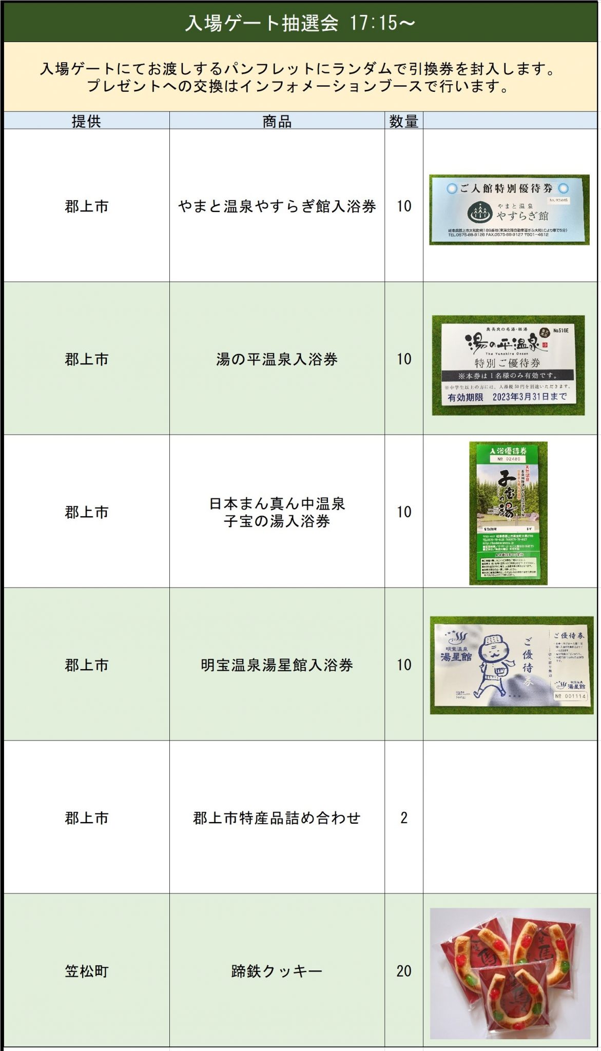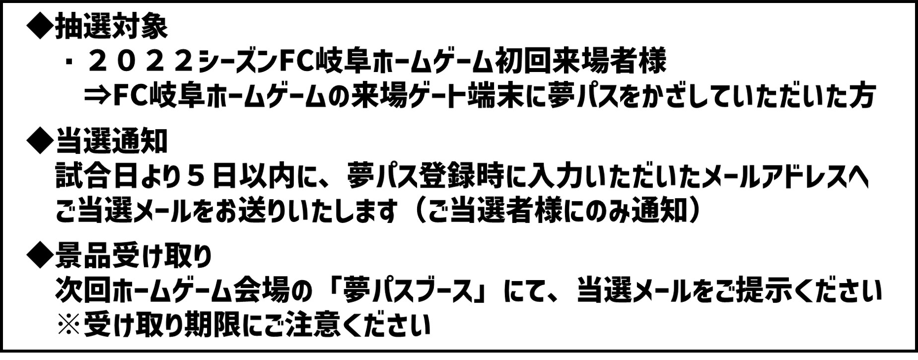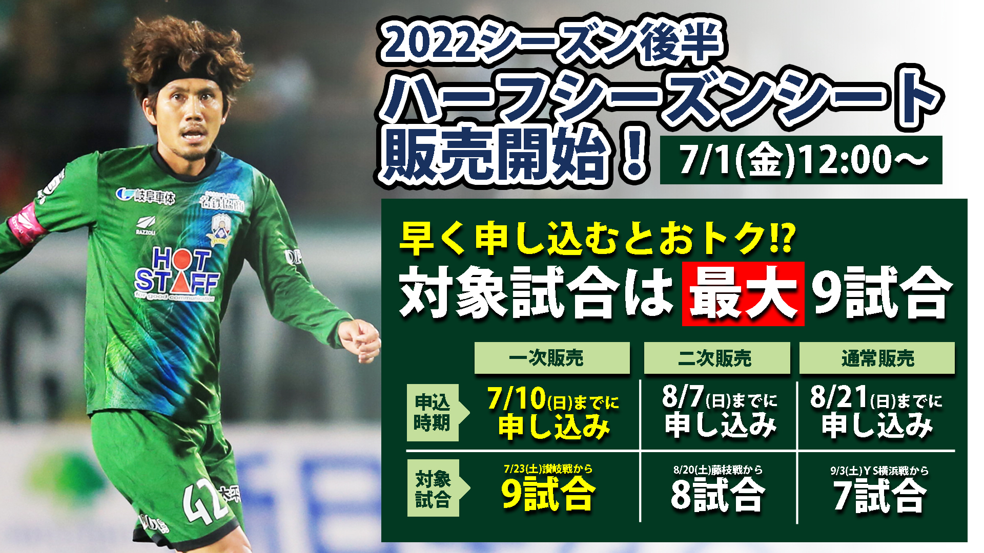 ★ハーフシーズンシートブース 16:00~ 【場所:サンサンデッキ】 後半戦もFC岐阜を熱く応援!2022シーズン後半戦”全試合”観戦可能なハーフシーズンシートの受付を行います。 【一次販売期間(7/10(日)まで)】 ★試合会場受付限定!新規入会者紹介キャンペーン 16:00~ 【場所:ファンクラブブース】 7月のホームゲームにおいて、『ファンクラブ新規入会者紹介キャンペーン』を実施いたします。 2022ファンクラブ会員の方が、2022ファンクラブ新規入会の方をご紹介いただくと、新規入会者に『クリアポーチ』・既存会員に『選手サイン色紙』をプレゼント! 更に!ゴールド会員に新規入会者をご紹介いただくと、先着20組限定で、オリジナルクッションプレゼント! 試合会場受付限定のキャンペーンとなりますので、ぜひご家族・お友達とご来場いただき、ご入会ください。 ※新規入会者ご本人が来場して入会した場合のみ対象となります。 ★【ファンクラブ会員対象】Jリーグ加盟15周年企画!来場して歴代ファンクラブ特典をもらおう! 16:00~ 【場所:ファンクラブブース】 5月~7月のホームゲームにおいて、ファンクラブ来場キャンペーンを実施します。 ファンクラブ会員が1試合来場につき、1個スタンプを押印します。情報カードの裏面をスタンプカードとして使用します。忘れずにお持ちください。 試合当日入会でもご参加いただけます。 ■プレゼント内容 ☆2回来場 でプレゼント! ・チケットホルダー ☆4回来場 /どれか1つプレゼント! ・シューズケース ・トートバック ・エコバック ※無くなり次第終了 ※プレゼント内容は途中で変更となることがあります。 ■対象試合 5月15日(日)相模原戦 18日(水)鳥取戦 ■スタンプ押印場所/時間 ファンクラブブース/キックオフ3時間前 ~ キックオフまで ※試合によって実施時間が異なる場合がございます。 ■備考 ※参加は会員ご本人様に限ります。代理の方によるスタンプの収集はできません。 ※情報カードを忘れた場合はご参加いただけませんので予めご了承ください。 ※情報カードを紛失した場合は、手数料500円で再発行できます。以前に貯めていただいたスタンプは無効となります。 ※プレゼント内容やキャンペーン内容は変更となる場合があります。