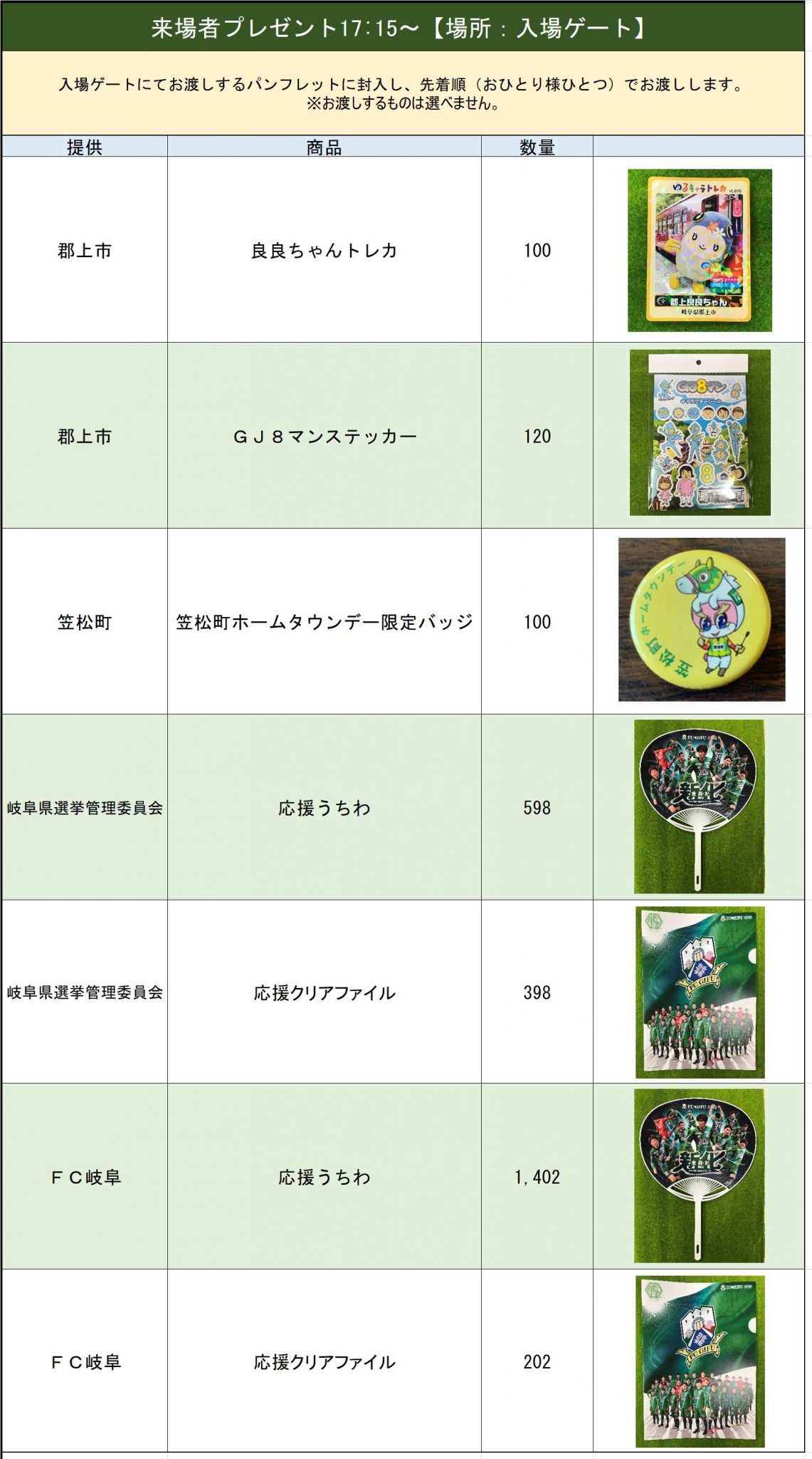 先行入場/17:15~ ※当日は陸上併催のため、通常と入場時間が変わっております。お気を付けください。 【ホームチーム横断幕設置時間】 16:30~17:00 19:03キックオフ この度「Jリーグ新型コロナウイルス感染症対応ガイドライン」が改定され、引き続き、感染拡大防止策として「マスク着用でのご来場」が求められております。 FC岐阜ホームゲームにおいても引き続き、ご来場時のマスク着用をお願いいたします。 皆さまの感染症対策へのご理解・ご協力をお願いいたします。 詳しくはこちら