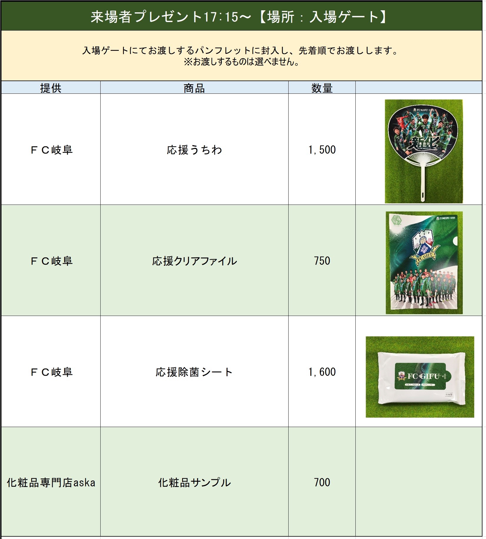 スタジアムへ来場される際に映像を参考にしていただくなどぜひご活用ください。 ※試合当日になりましたらご覧いただけます。 ★スポンサー企業展 16:00~ 【場所:芝生広場】 地元企業の魅力が発見でき、キッズが楽しめるブースがいっぱいのFC岐阜スポンサー企業展です! ★ハーフシーズンシートブース 16:00~ 【場所:サンサンデッキ】 後半戦もFC岐阜を熱く応援!2022シーズン後半戦”全試合”観戦可能なハーフシーズンシートの受付を行います。 【一次販売期間(7/10(日)まで)】 ★試合会場受付限定!新規入会者紹介キャンペーン 16:00~ 【場所:ファンクラブブース】 7月のホームゲームにおいて、『ファンクラブ新規入会者紹介キャンペーン』を実施いたします。 2022ファンクラブ会員の方が、2022ファンクラブ新規入会の方をご紹介いただくと、新規入会者に『クリアポーチ』・既存会員に『選手サイン色紙』をプレゼント! 更に!ゴールド会員に新規入会者をご紹介いただくと、先着20組限定で、オリジナルクッションプレゼント! 試合会場受付限定のキャンペーンとなりますので、ぜひご家族・お友達とご来場いただき、ご入会ください。 ※新規入会者ご本人が来場して入会した場合のみ対象となります。 ★【ファンクラブ会員対象】Jリーグ加盟15周年企画!来場して歴代ファンクラブ特典をもらおう! 16:00~ 【場所:ファンクラブブース】 5月~7月のホームゲームにおいて、ファンクラブ来場キャンペーンを実施します。 ファンクラブ会員が1試合来場につき、1個スタンプを押印します。情報カードの裏面をスタンプカードとして使用します。忘れずにお持ちください。 試合当日入会でもご参加いただけます。 ■プレゼント内容 ☆2回来場 /どちらか1つプレゼント! ・ギッフィー巾着&ミラー ・チケットホルダー ☆4回来場 /どれか1つプレゼント! ・シューズケース ・トートバック ・エコバック ※無くなり次第終了 ※プレゼント内容は途中で変更となることがあります。 ■対象試合 5月15日(日)相模原戦 18日(水)鳥取戦 ■スタンプ押印場所/時間 ファンクラブブース/キックオフ3時間前 ~ キックオフまで ※試合によって実施時間が異なる場合がございます。 ■備考 ※参加は会員ご本人様に限ります。代理の方によるスタンプの収集はできません。 ※情報カードを忘れた場合はご参加いただけませんので予めご了承ください。 ※情報カードを紛失した場合は、手数料500円で再発行できます。以前に貯めていただいたスタンプは無効となります。 ※プレゼント内容やキャンペーン内容は変更となる場合があります。
