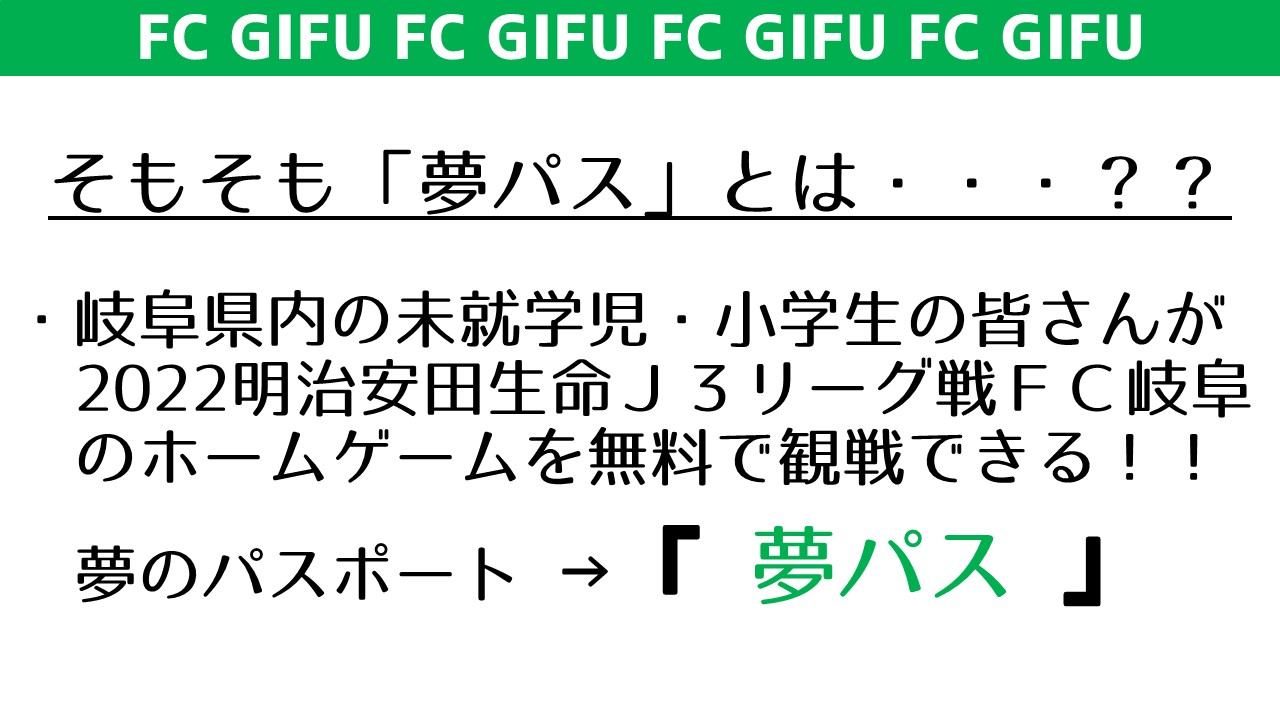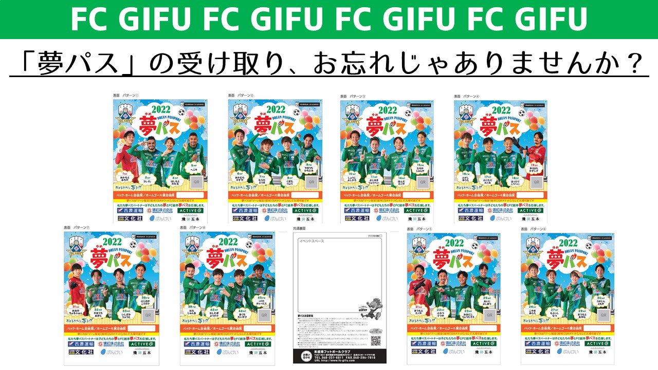 2022.06.28 (Tue) お知らせ 【お忘れじゃありませんか!?】2022夢パスの受け取りについて https://www.fc-gifu.com/tickets/dream_pass/ 夢パス案内ページはこちら 今すぐに夢パスを申し込みたい方はこちら
