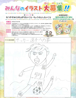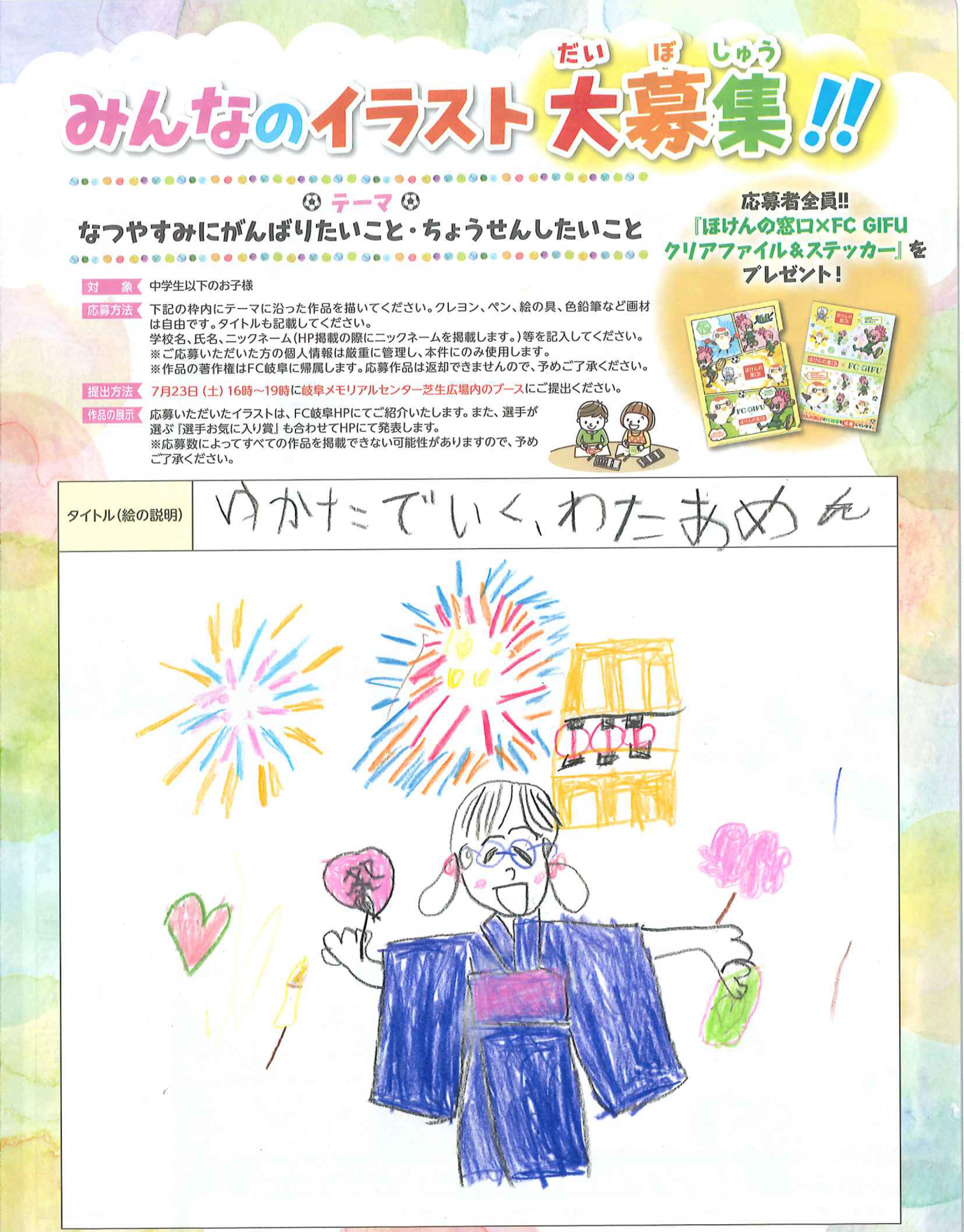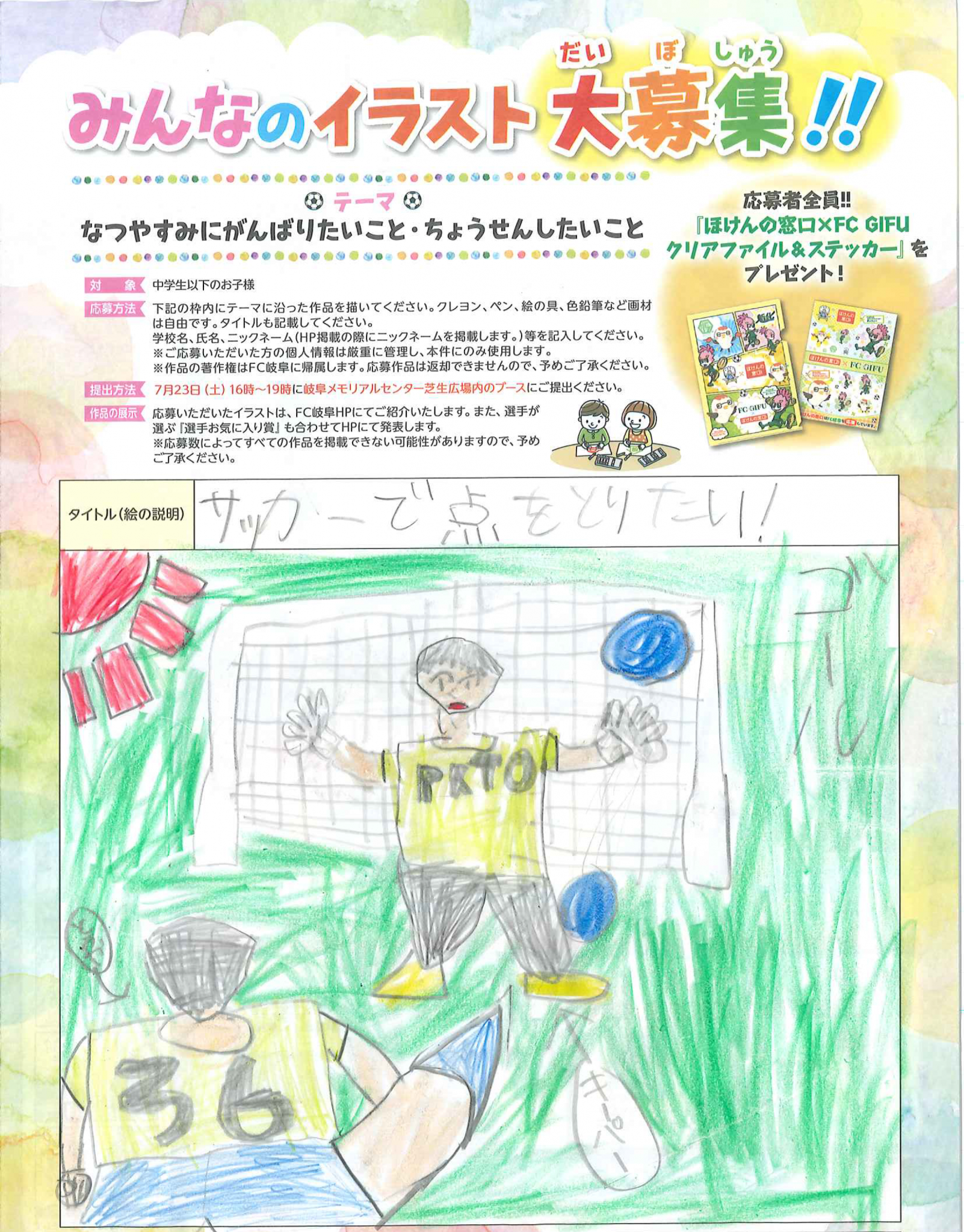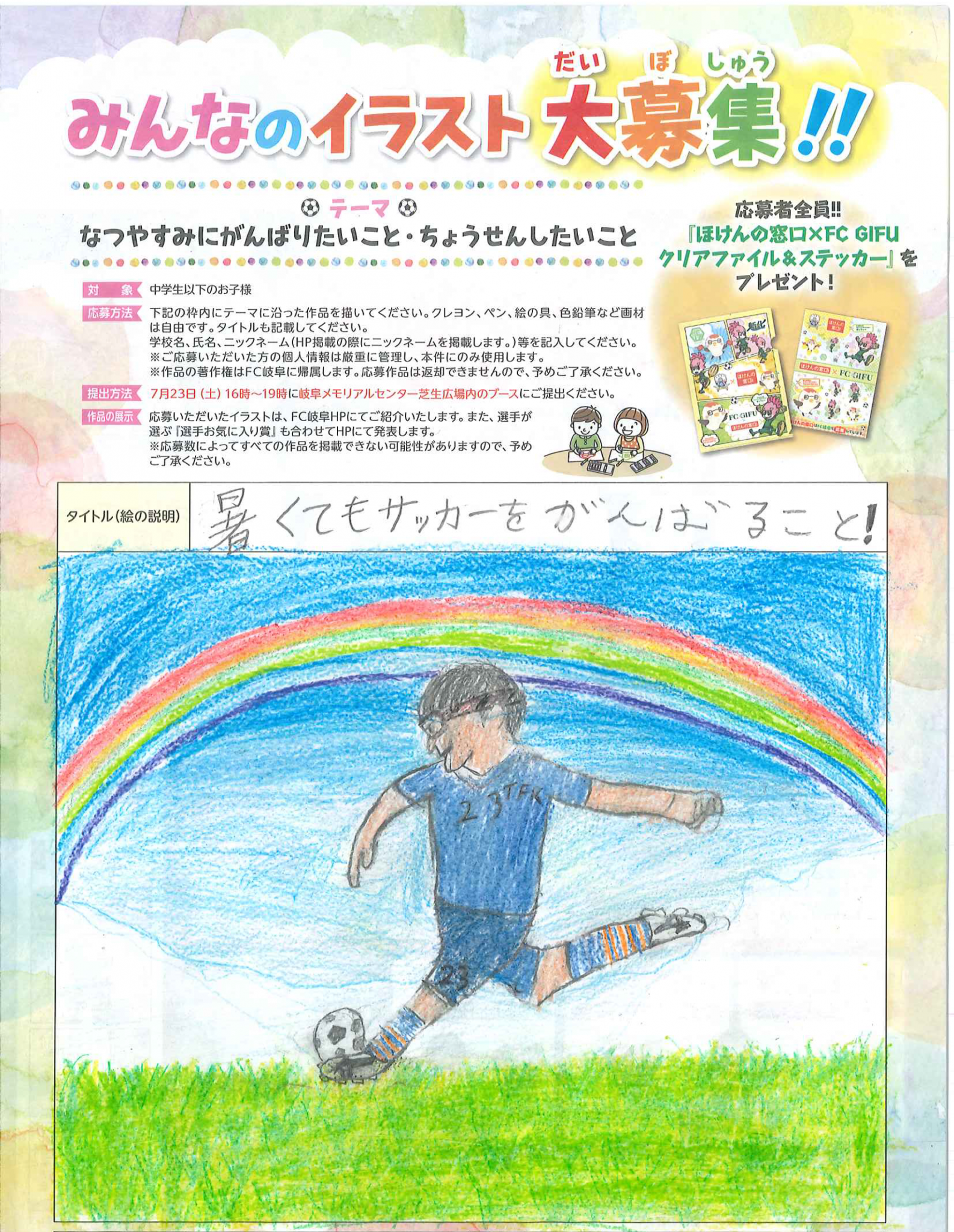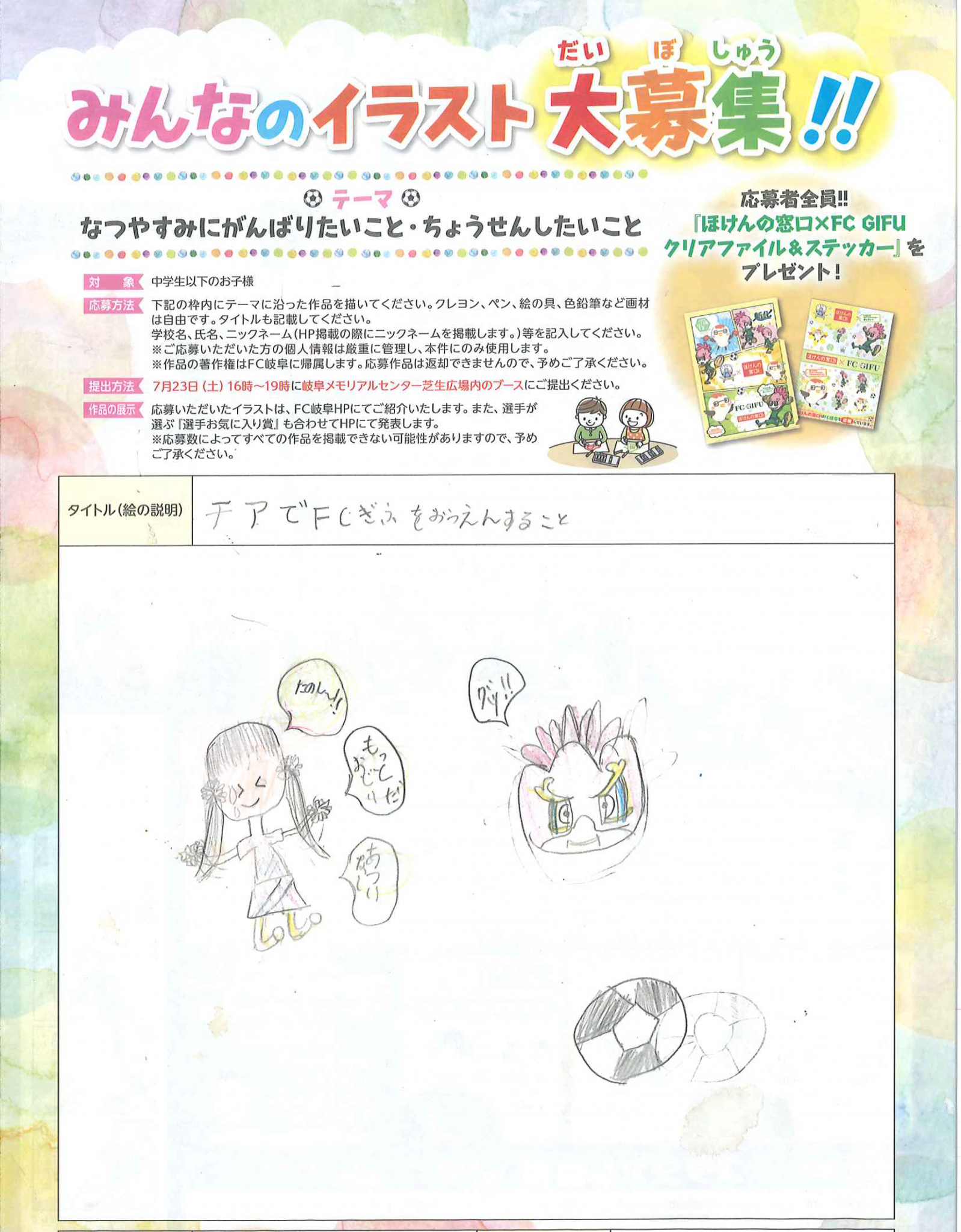 なお、ご応募いただいたイラストは、下記の通り『明治安田生命J3リーグ第21節 FC岐阜vs藤枝MYFC戦』の試合会場にて展示いたします。