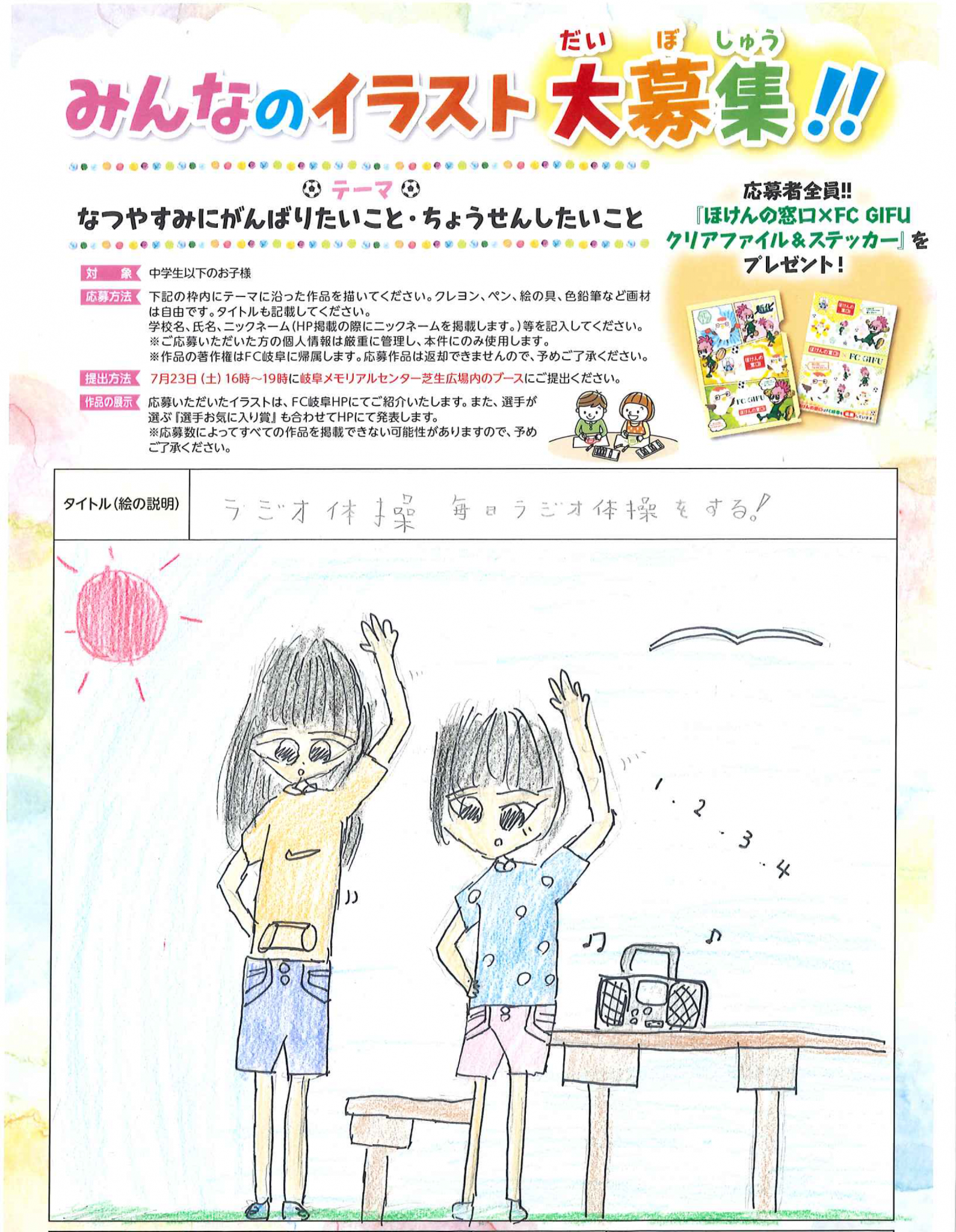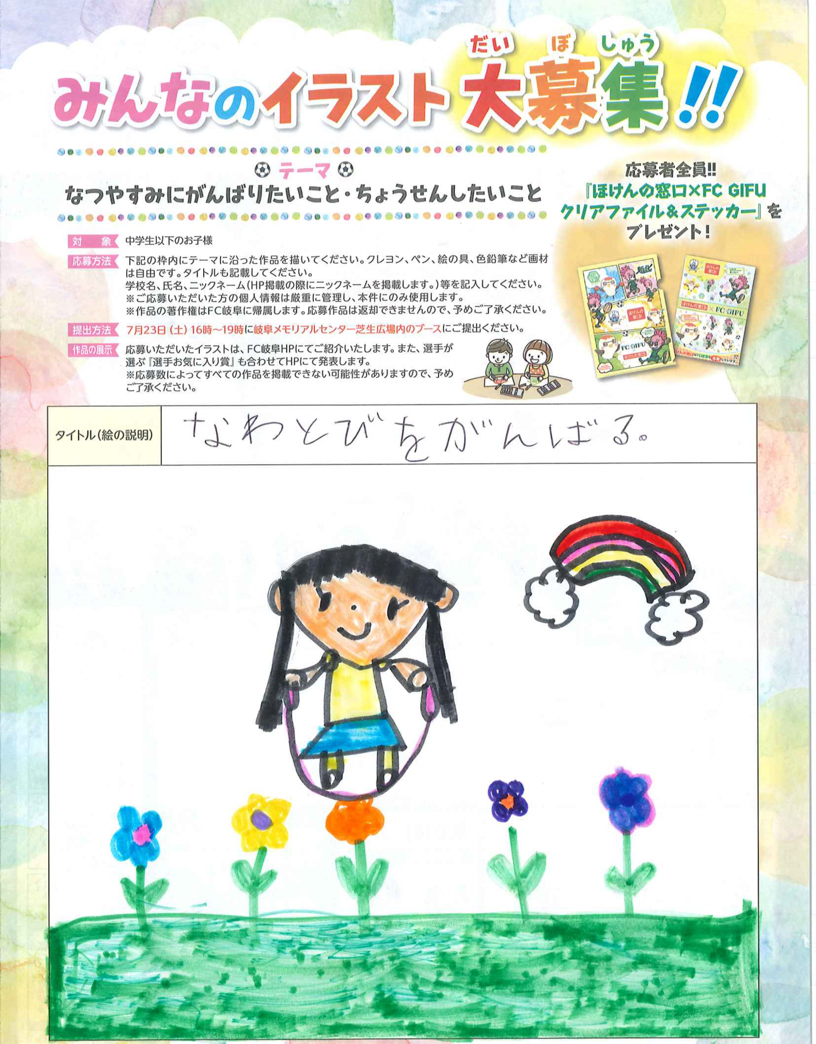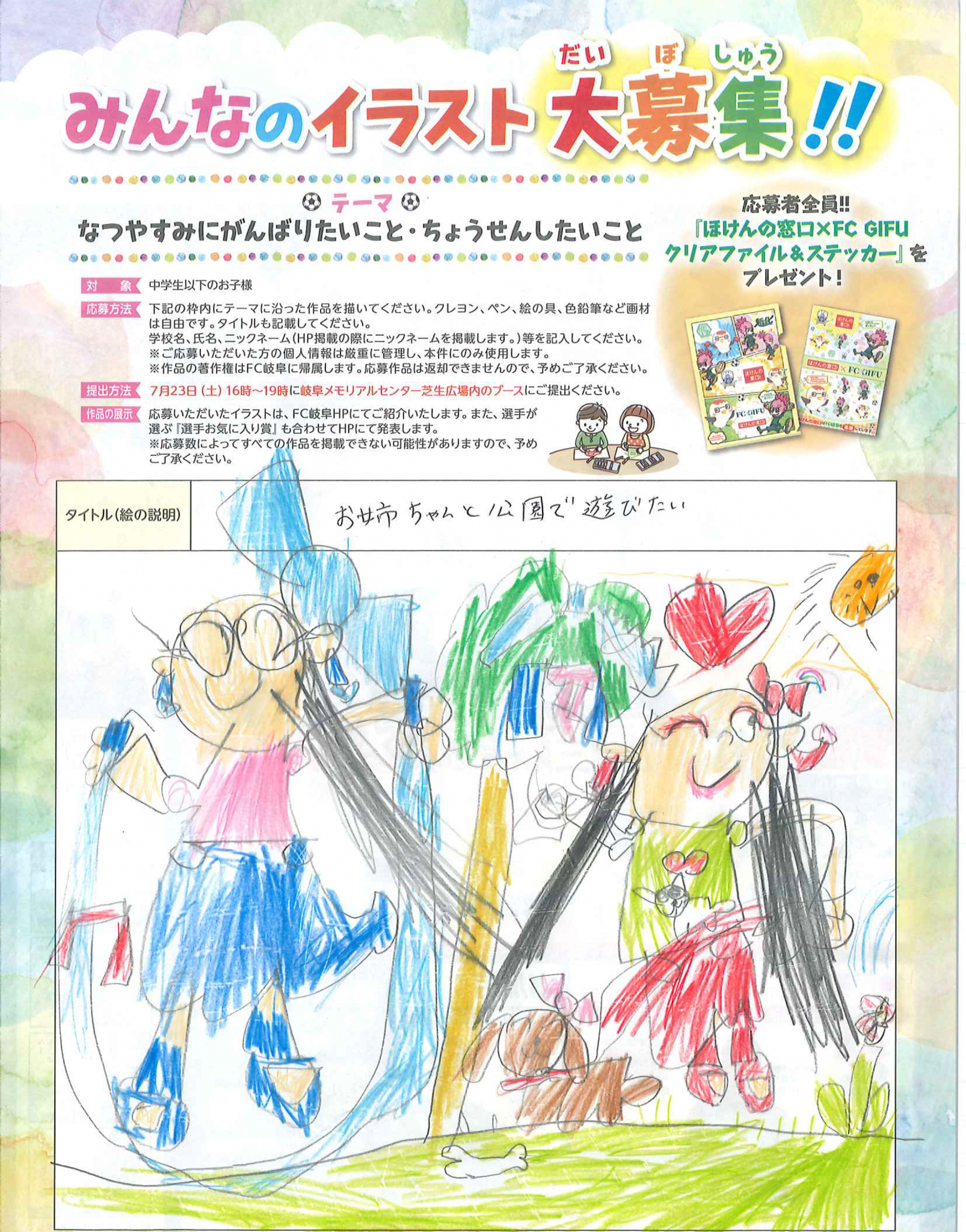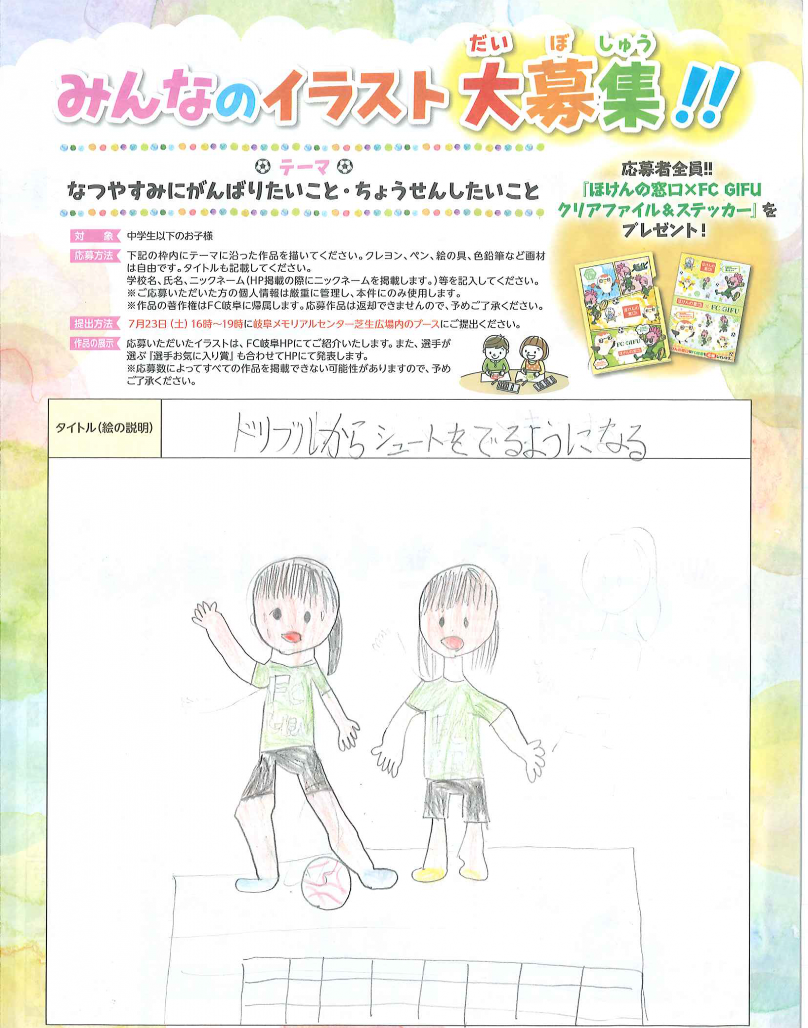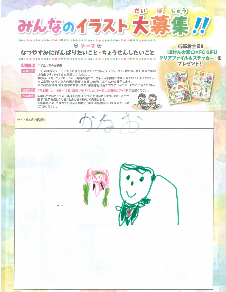 なお、ご応募いただいたイラストは、下記の通り『明治安田生命J3リーグ第21節 FC岐阜vs藤枝MYFC戦』の試合会場にて展示いたします。