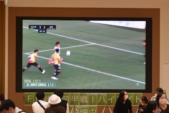 当日はマーサスクエアの大型ビジョンにて、FC岐阜の前半戦ハイライトも放映し多くの方に足を止めてご観覧いただきました。