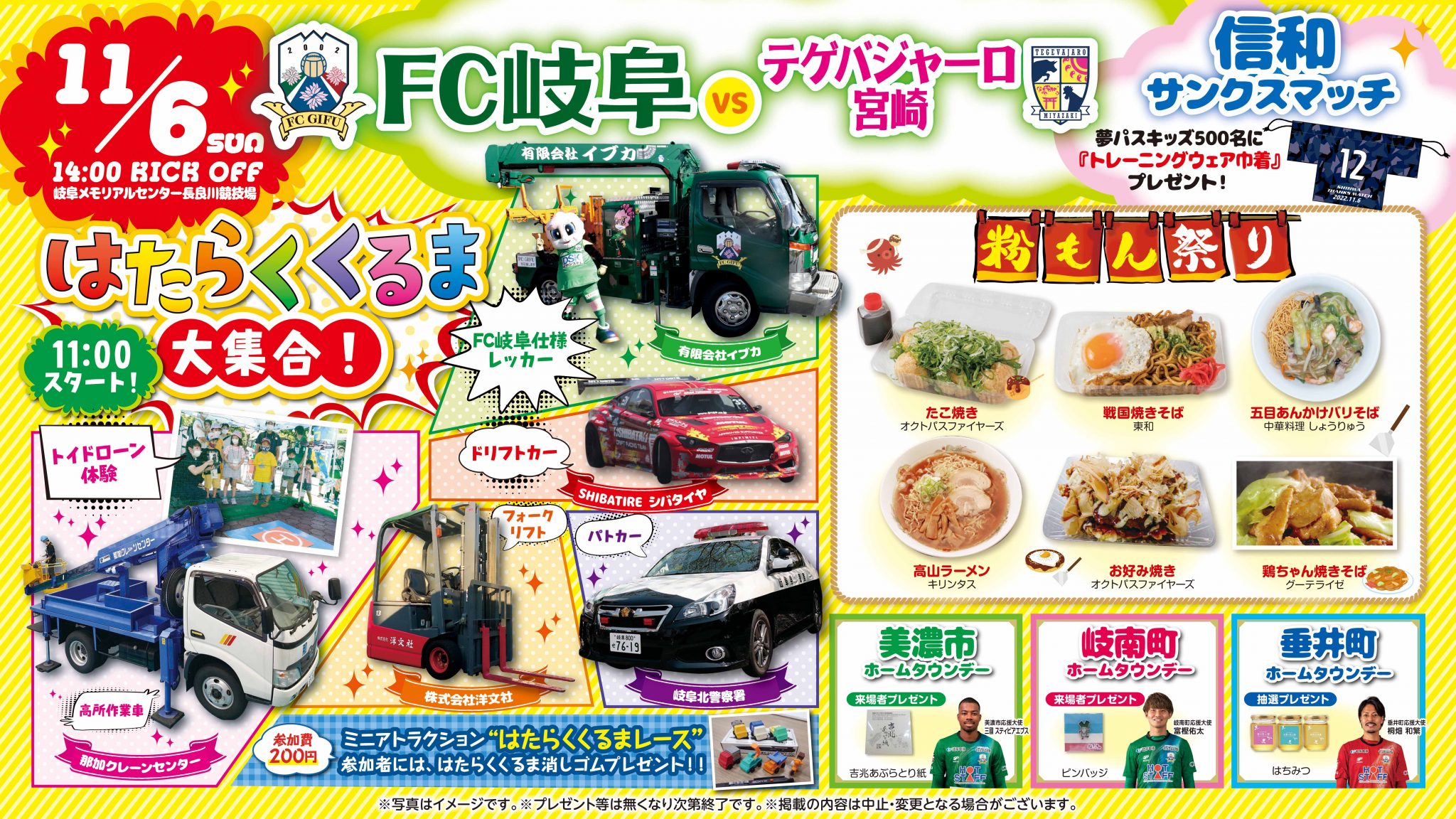 ★FC岐阜応援隊 『SKE48』来場 FC岐阜応援隊の『SKE48』から隊長の北野瑠華さん、副隊長の太田彩夏さん、石黒友月さん、仲村和泉さんが来場し、スタジアムを華やかに盛り上げます! ★粉もん祭り 11:00~ 【場所:屋台村】 「お好み焼き」や「たこ焼き」など大人気粉もんフードが大集合!! 是非お立ち寄りください。 はたらくくるま大集合 11:00~ 【芝生広場東】 スタジアムにはたらく車が大集合!乗車体験や記念写真で楽しもう! ★【夢パスキッズ限定】トレーニングウェア巾着プレゼント! 11:30~ 【場所:夢パスゲート】 先着500名様に「トレーニングウェア巾着」をプレゼント! ★【夢パスキッズ限定】ピッチ内練習見学ツアー 13:15~13:45 【場所:スタジアム】 夢パスキッズ限定でピッチ内見学ツアーを開催します!試合前のFC岐阜の選手を間近で見よう! ※募集受付は終了いたしました。 ★【夢パスキッズ限定】ピッチ大開放 試合終了後 15分後~30分間 【場所:スタジアム】 夢パスキッズ対象!試合終了後のピッチで遊ぼう!定員:当日先着50組(100名様) ★エンジョイトレーニング教室 11:30~12:00 【場所:芝生広場】 岐阜市スポーツ交流センターで開催し、毎回ご好評をいただいている大野貴浩アスレティックトレーナーによる「エクササイズ教室」の規模を拡大し、「エンジョイトレーニング教室」として芝生広場にて開催します。柔軟性アップ、筋力アップ、姿勢改善、ダイエットなどをテーマに楽しくトレーニングを行います。定期的なトレーニングで、ココロもカラダも磨いていきましょう!(参加無料) ★いじめ撲滅プロレス 12:30~13:30 【場所:芝生広場】 ぎふオレンジリボン運動の協賛イベントとして、いじめ撲滅 元気創造プロレスを開催します。 ◆ちびっこプロレス教室 12:30~ ★信和プレゼンツピッチサイド足場シート 13:00~ 【場所:芝生広場】 信和株式会社様は、くさび緊結式足場をはじめとした仮設資材のメーカー様です。 ※募集受付は終了いたしました。 ★シーズンシート・ファンクラブ会員限定!選手直筆サイン色紙が当たる!ハーフタイム抽選会 【対象】