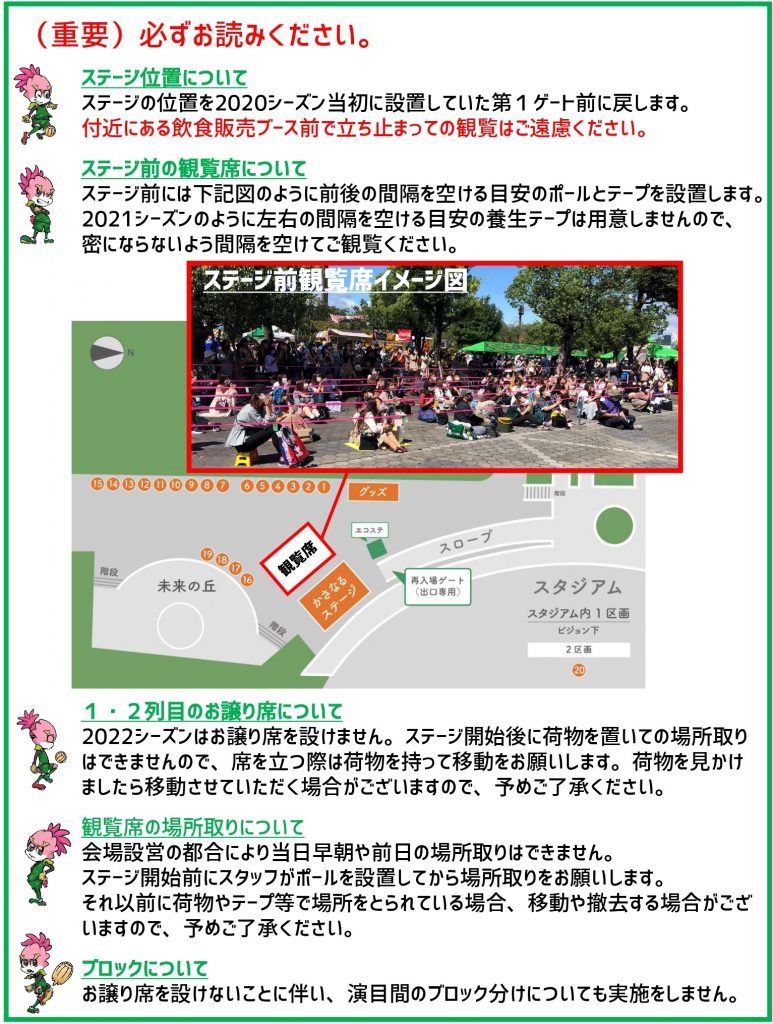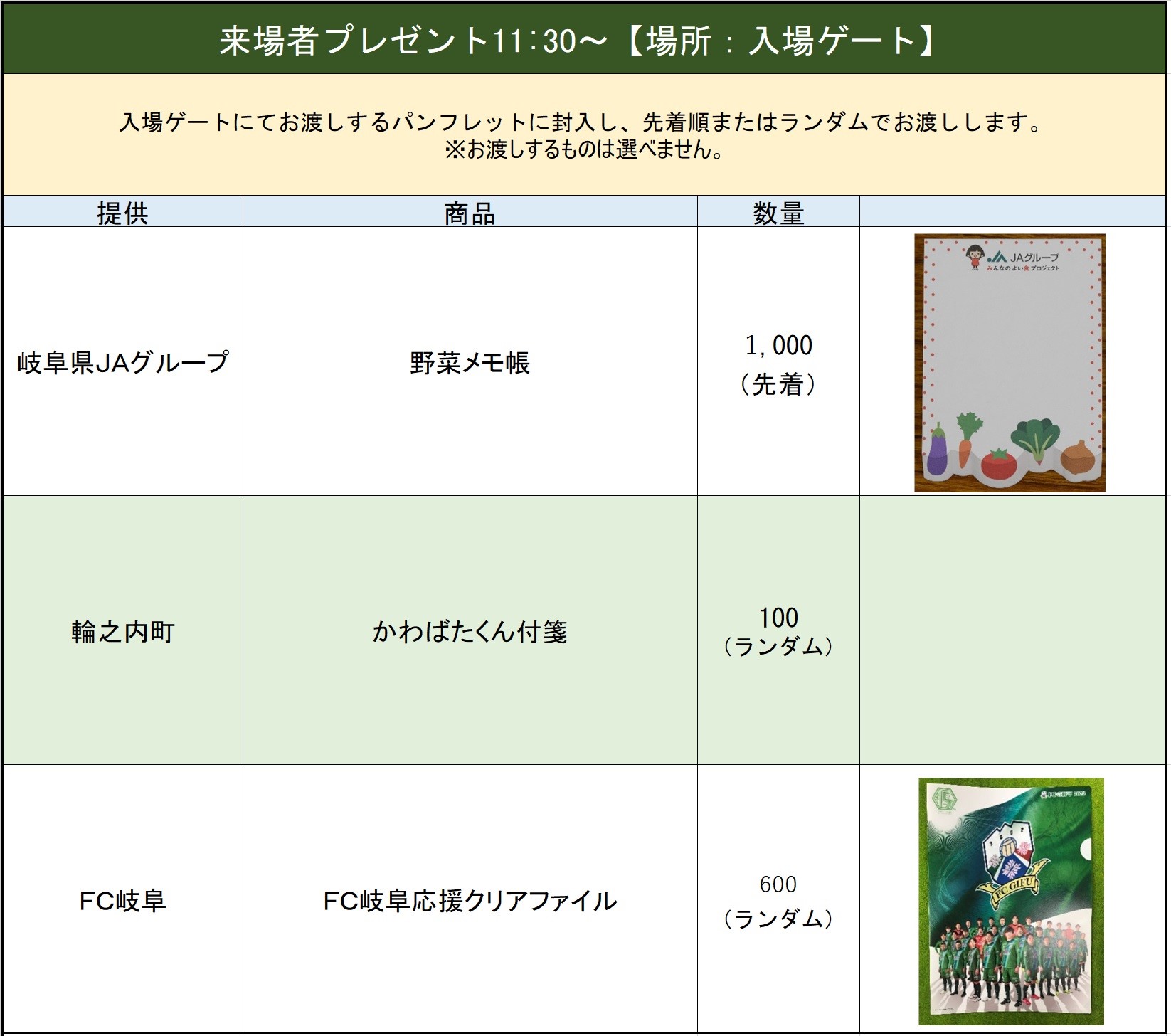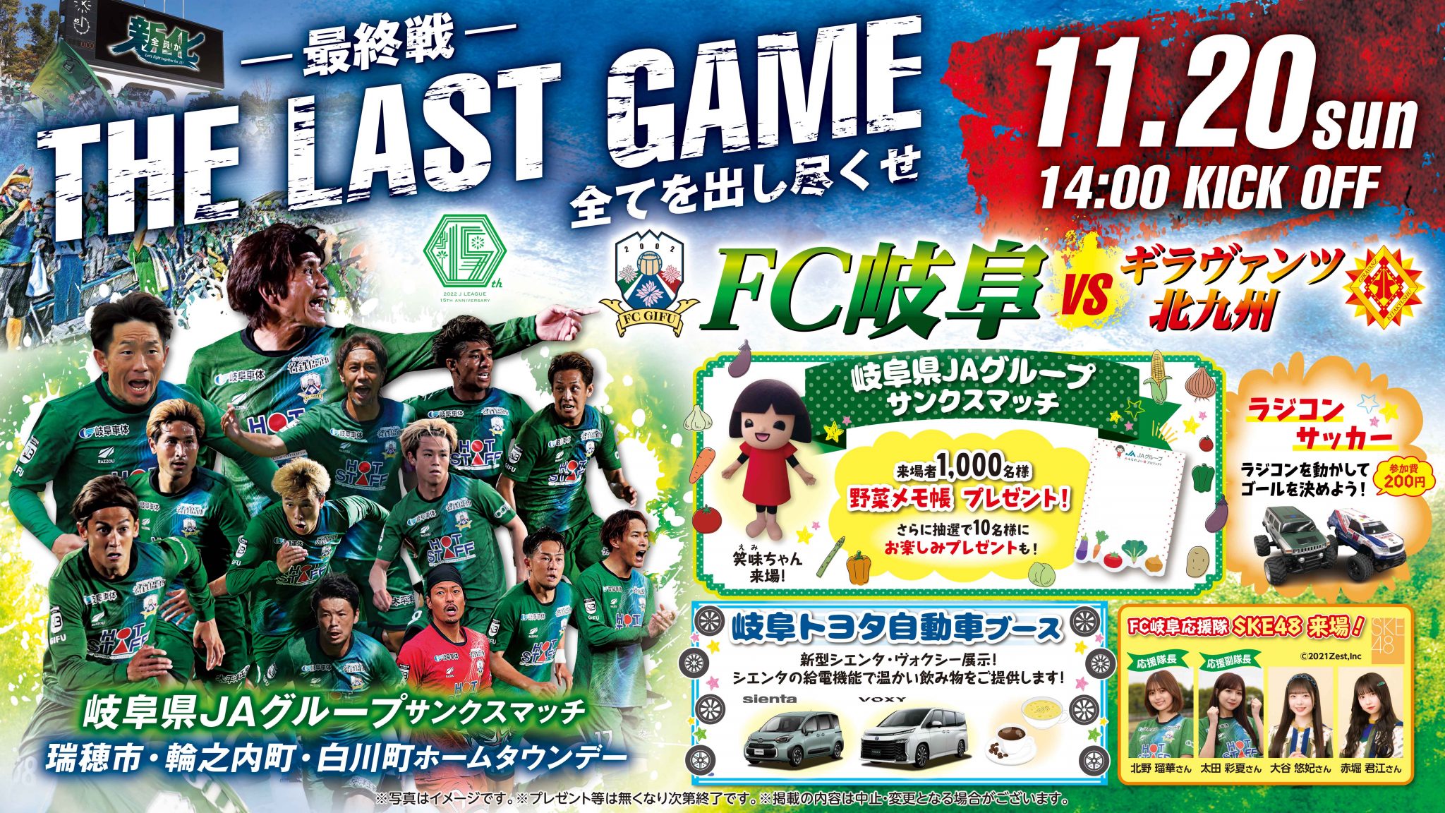 ★FC岐阜応援隊 『SKE48』来場 FC岐阜応援隊の『SKE48』から隊長の北野瑠華さん、副隊長の太田彩夏さん、大谷悠妃さん、赤堀君江さんが来場し、スタジアムを華やかに盛り上げます! ★岐阜県JAグループブース 11:00~ 【場所:芝生広場東】 乃木坂46クリアファイル、雑誌「家の光」がもらえる地産地消アンケートの実施、キューブ米の配布、骨健康測定、交通安全体験、粗品プレゼントなど盛り沢山のブースですので、ぜひお立ち寄り下さい。グループのキャラクター「笑味ちゃん」・「よりゾウ」・「ぎふマイの里」も来場します。 ★岐阜トヨタ自動車ブース 11:00~ 【場所:芝生広場東】 新型シエンタ・ヴォクシー展示中。クルマの給電機能で温かい飲み物をご提供します!お気軽にお立ち寄りください。 さらに、岐阜トヨタブースにお越しいただいた先着100名様にSDGsカレーをプレゼント!! ★WORK!DIVERSITY(ワークダイバーシティ) プロジェクト in 岐阜 相談ブース 11:00~ 【場所:サンサンデッキ】 働きづらさを抱える岐阜市民を対象とした、新しい就労支援モデルをつくるプロジェクトです。さまざまな理由から「働きたいのに働けない」状況にある方へ、一人ひとりに寄り添ったサポートを提供していただけます。是非この機会にお気軽にお問合せ・お立ち寄りください。 ★選手へのプレゼント品受け取り&引退選手へのメッセージ募集ブース 11:00~ 【場所:サンサンデッキ(雨天時:芝生広場東)】 2022シーズンの最終戦、選手へのプレゼント品受け取りと、引退選手へのメッセージ募集ブースを設置します。2022シーズンを共に戦った選手への想いをぜひお寄せください。 ★日本財団「海と日本プロジェクト CHANGE FOR THE BLUE」 日本財団「海と日本プロジェクト」が取り組んでいるプロジェクト「CHANGE FOR THE BLUE」の一環として、長良川クリーンアクションを開催します。ファン・サポーターやスタッフと協力して、海なし県から海洋ごみをなくすべく、試合前の清掃活動を実施します。長良川を望むスタジアムで清掃活動を行うことで、未来の海をみんなで守りましょう。この機会にぜひ奮ってご参加ください。 ★エンジョイトレーニング教室 11:30~12:00 【場所:芝生広場】 岐阜市スポーツ交流センターで開催し、毎回ご好評をいただいている大野貴浩アスレティックトレーナーによる「エクササイズ教室」の規模を拡大し、「エンジョイトレーニング教室」として芝生広場にて開催します。柔軟性アップ、筋力アップ、姿勢改善、ダイエットなどをテーマに楽しくトレーニングを行います。定期的なトレーニングで、ココロもカラダも磨いていきましょう!(参加無料) ★2022サンクスセレモニー 試合終了後 【場所:スタジアム】 FC岐阜を支えてくださった全ての皆様に感謝の気持ちを込めて2022サンクスセレモニーを開催します。 ※2021シーズンの様子 ★ファンクラブ・ゴールド会員限定ピッチ内練習見学ツアー 13:15~13:45 【場所:スタジアム】 ファンクラブ・ゴールド会員限定で『ピッチ内練習見学ツアー』を開催します!ぜひ、試合前の選手の様子を間近でお楽しみください!(事前募集 20組40名様) ★シーズンシート・ファンクラブ会員限定!ハーフタイム抽選会 【対象】