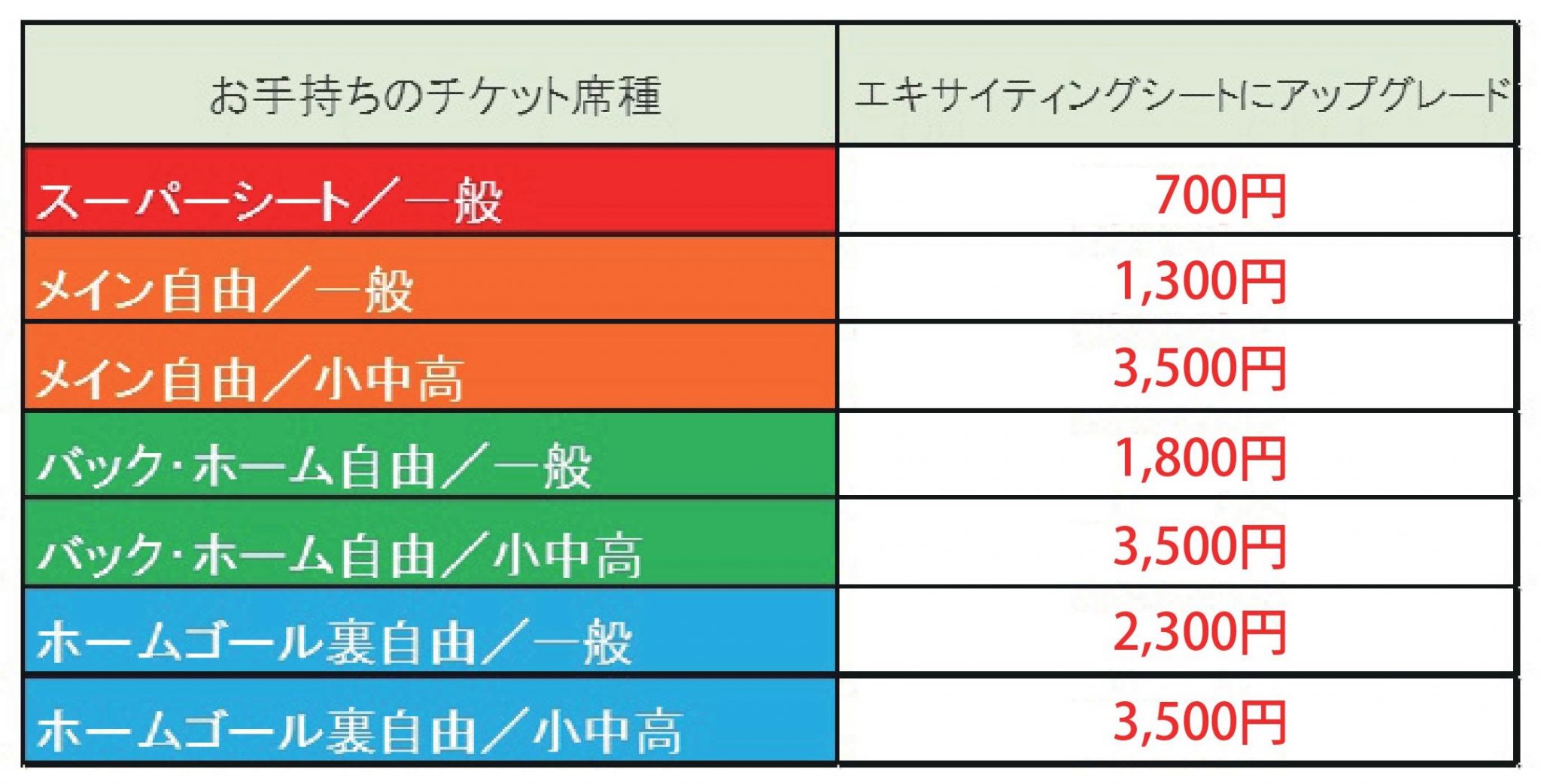 (ホームゲーム当日、お手持ちのチケットをエキサイティングシートへ変更(アップグレード)することができます。変更希望のチケットをお持ちの上、当日券売り場にお越しください)