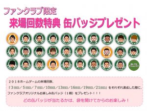 2018ホームゲームの来場回数、『3回目/5回目/7回目/10回目/13回目/16回目/19回目/21回目』をそれぞれ達成した際に、ファンクラブオリジナルお楽しみ缶バッジ(1個)をプレゼントします。