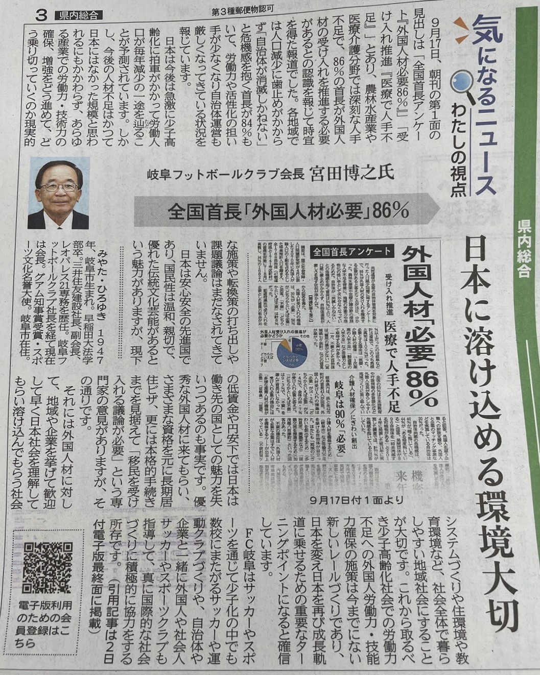 岐阜新聞『気になるニュース・わたしの視点』宮田博之会長 執筆記事について