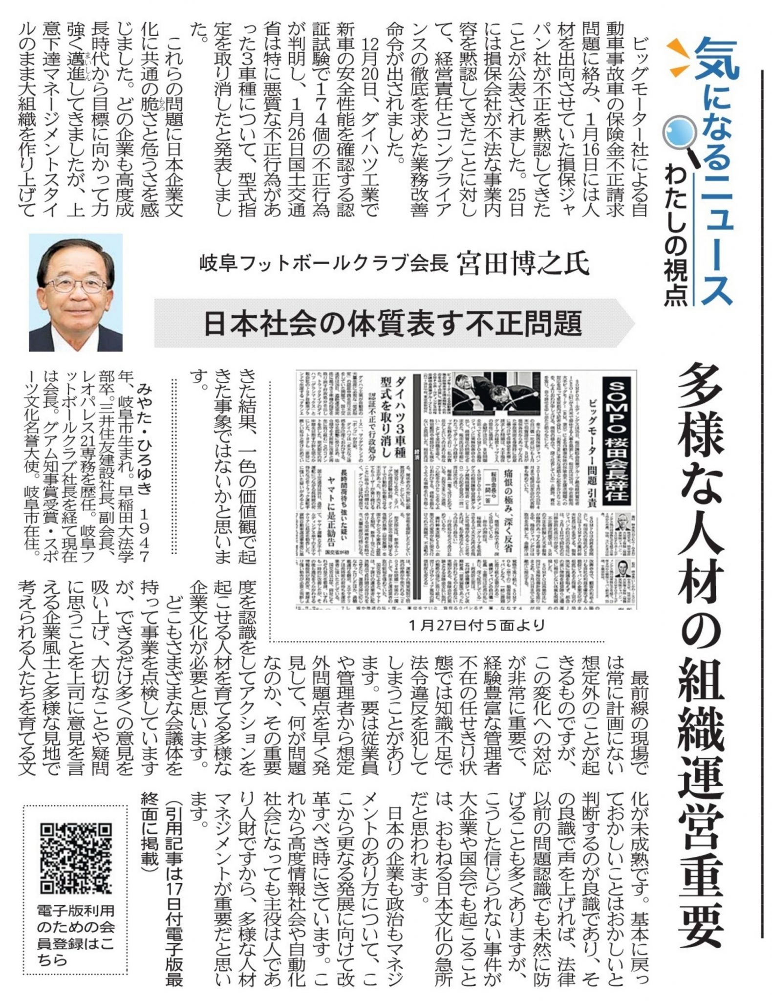 岐阜新聞『気になるニュース・わたしの視点』宮田博之会長 執筆記事について