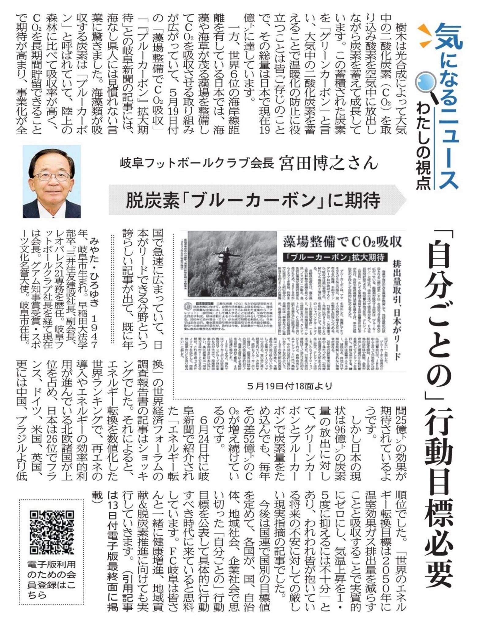 2024.08.01 (Thu) メディア 岐阜新聞『気になるニュース・わたしの視点』宮田博之会長 執筆記事について 岐阜新聞(県内版)に掲載されている「気になるニュース・わたしの視点」に宮田博之会長が執筆した記事が掲載されました。 「気になるニュース・わたしの視点」は岐阜新聞に掲載されたニュースに関する感想、持論、展望、知見をご紹介するものです。 ぜひ、ご覧ください。 岐阜新聞 2024年7月13日付掲載