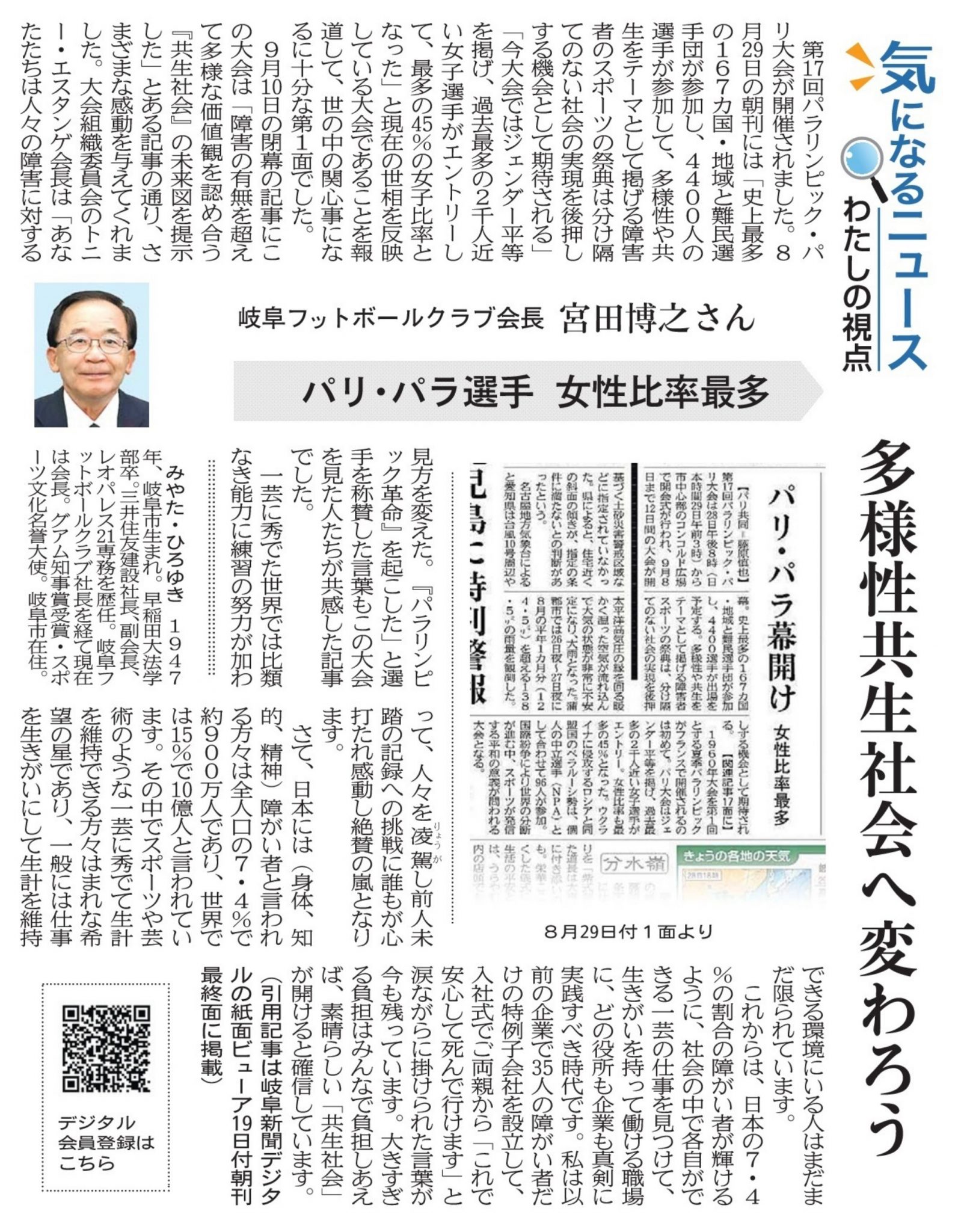 2024.12.05 (Thu) メディア 岐阜新聞『気になるニュース・わたしの視点』宮田博之会長 執筆記事について 岐阜新聞(県内版)に掲載されている「気になるニュース・わたしの視点」に宮田博之会長が執筆した記事が掲載されました。 「気になるニュース・わたしの視点」は岐阜新聞に掲載されたニュースに関する感想、持論、展望、知見をご紹介するものです。 ぜひ、ご覧ください。 岐阜新聞 2024年10月19日付掲載