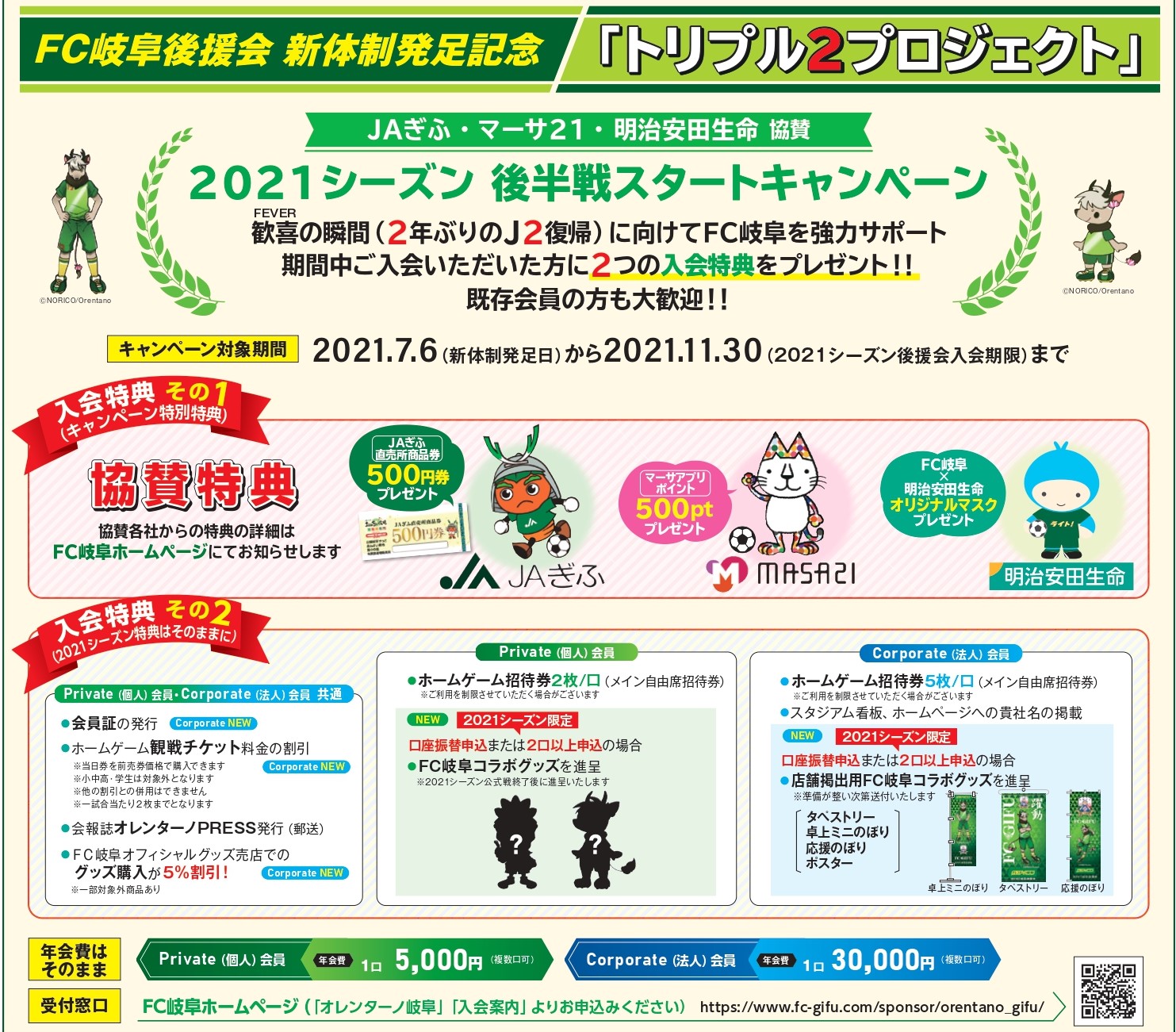 去る7月6日のFC岐阜後援会新体制発足を記念し、2年ぶりのJ2復帰を目指すFC岐阜を強力にサポートすべく、新役員企業3社(JAぎふ・マーサ21・明治安田生命)協賛による「トリプル2プロジェクト」2021シーズン後半戦スタートキャンペーンを実施します。