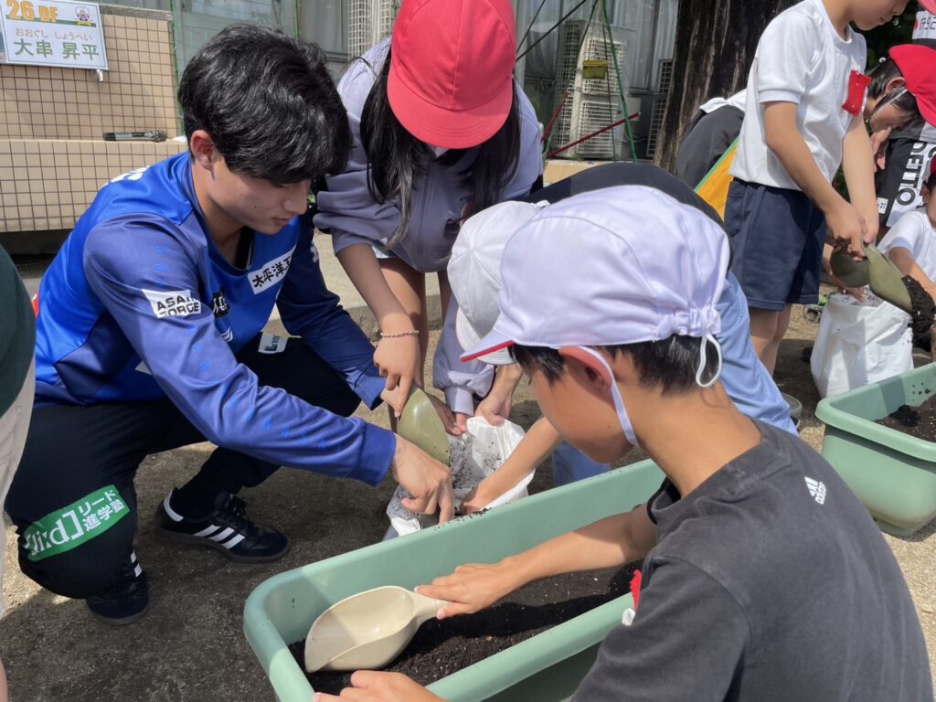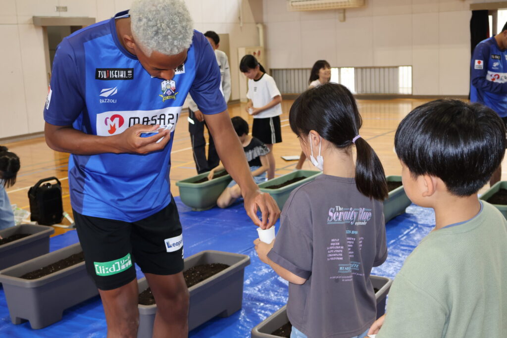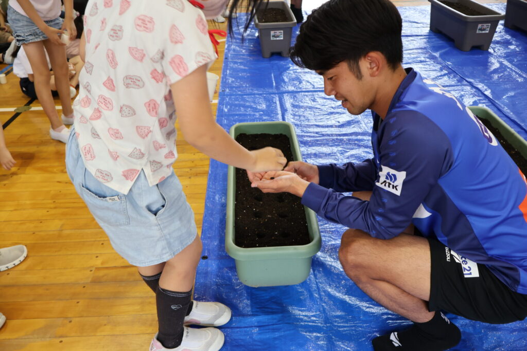 当日はトップチーム選手も参加し、児童と一緒にヘチマの種まきを行い交流をしました。