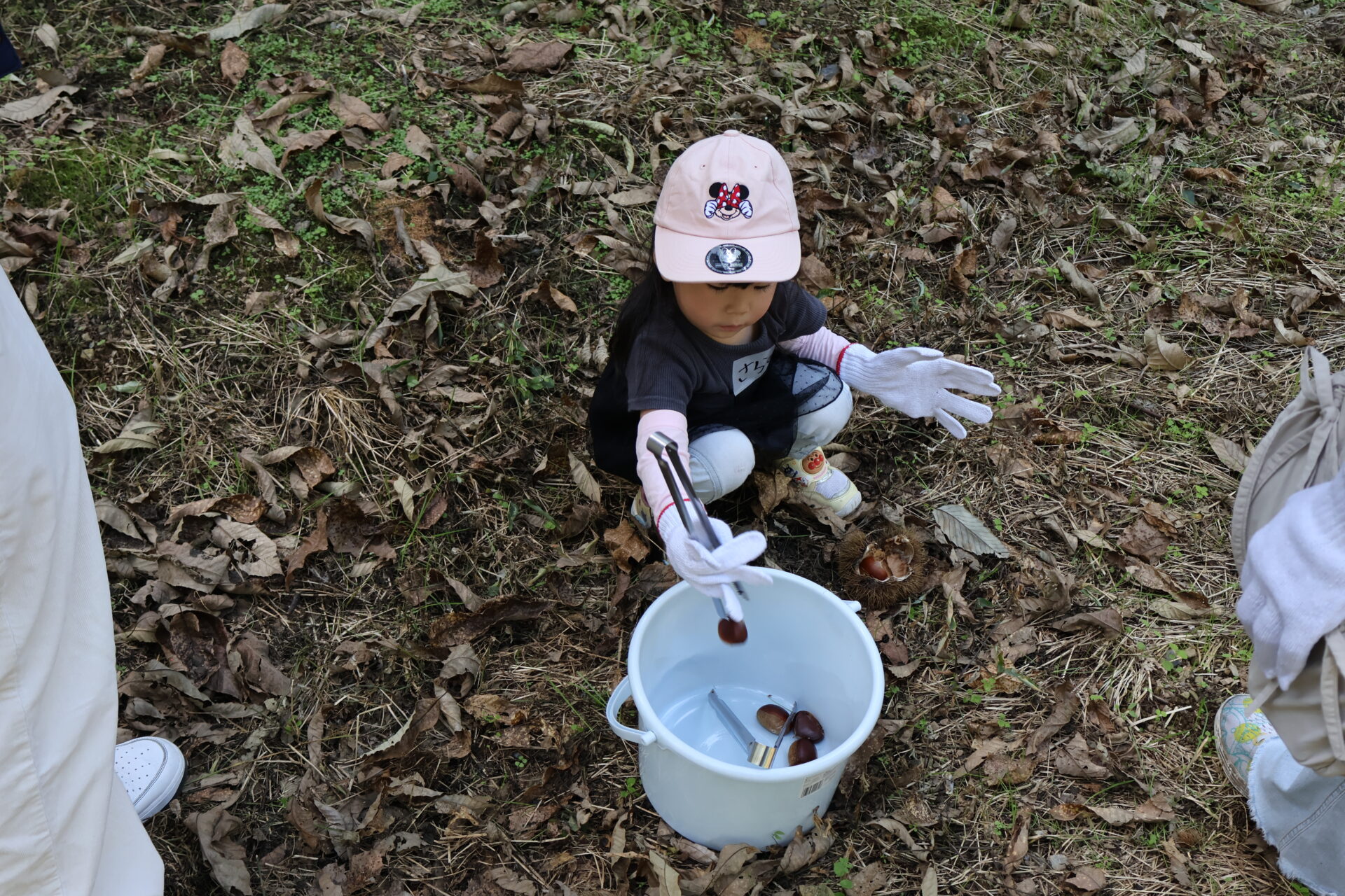 この活動は、本来は廃棄されてしまう「規格外の栗」を活用することで、食育・環境教育の視点から、山に入り、自然を五感で感じ、子どもたちに “自然の恵みをいただくありがたさ” や “食品ロスの問題” について楽しみながら学んでいただくことを目的として行いました。