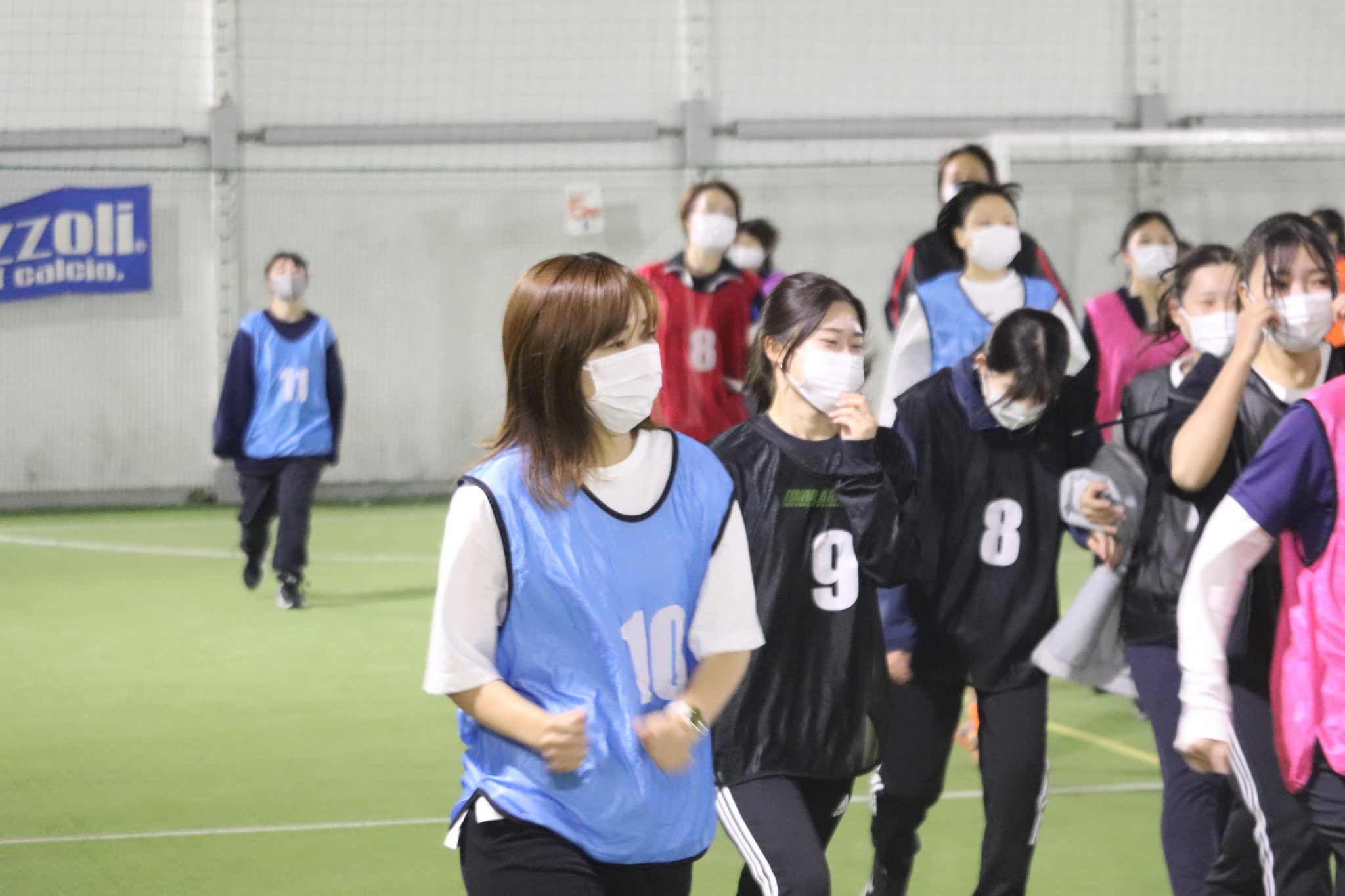 気温も低く、風もあり肌寒い天候であったため、ジョギングやスキップ、サイドステップなどで体を温めました。その後、傷害予防を目的としたストレッチを行い、最後は集合ゲームで心拍数を上げていきました。