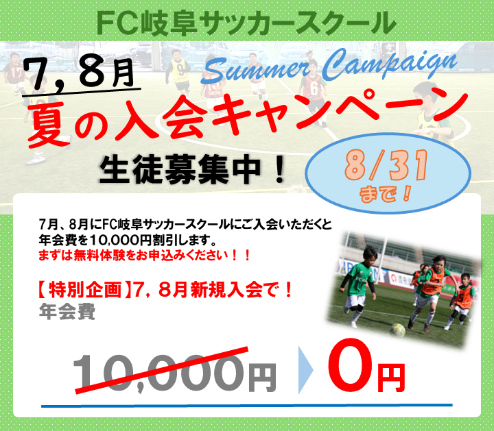 FC岐阜サッカースクールでは、7,8月に「夏の入会キャンペーン」を実施します。