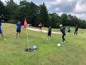 初日、長良川スポーツプラザをバスで出発し、お昼前に恵那市にあるアドニスゴルフクラブに到着しました。ゴルフ場のレセプションルームでオリエンテーションと自己紹介をして、お弁当を食べました。最初のアクティビティは、全員でフットゴルフ大会を開催しました。各組に分かれて、ハンディキャップを設定して、9ホールをラウンドしてスコアを競いました。ゴルフ場が初めてというスクール生も多く、大興奮していました。普段、ボールを蹴っているグラウンドとは違い、いろいろな傾斜や芝生を見ながら、子どもたちなりに考えてラウンドしている姿が印象的でした。