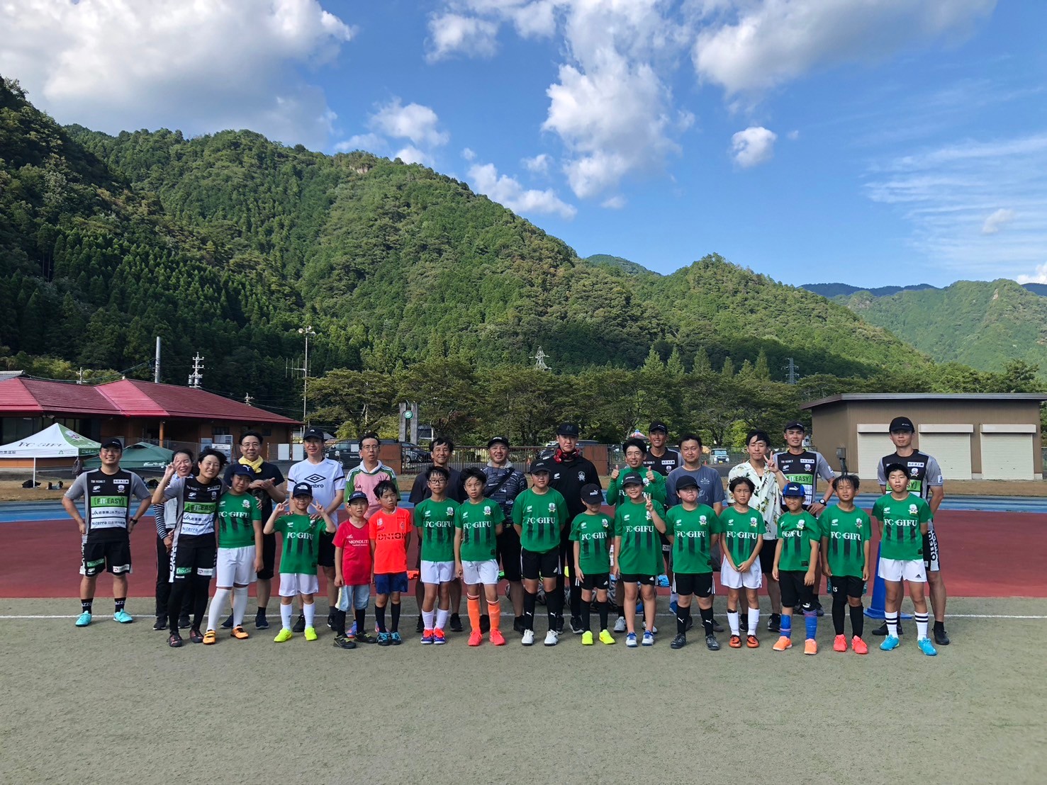 その後、近くの洞戸運動公園へ移動し、親子でサッカーを楽しみました。洞戸運動公園は、周囲を山々に囲まれ、板取川がすぐ近くに流れていることもあり、スポーツのキャンプ地のような雰囲気でした。気温も岐阜市と比べ2-3℃低いようでした。