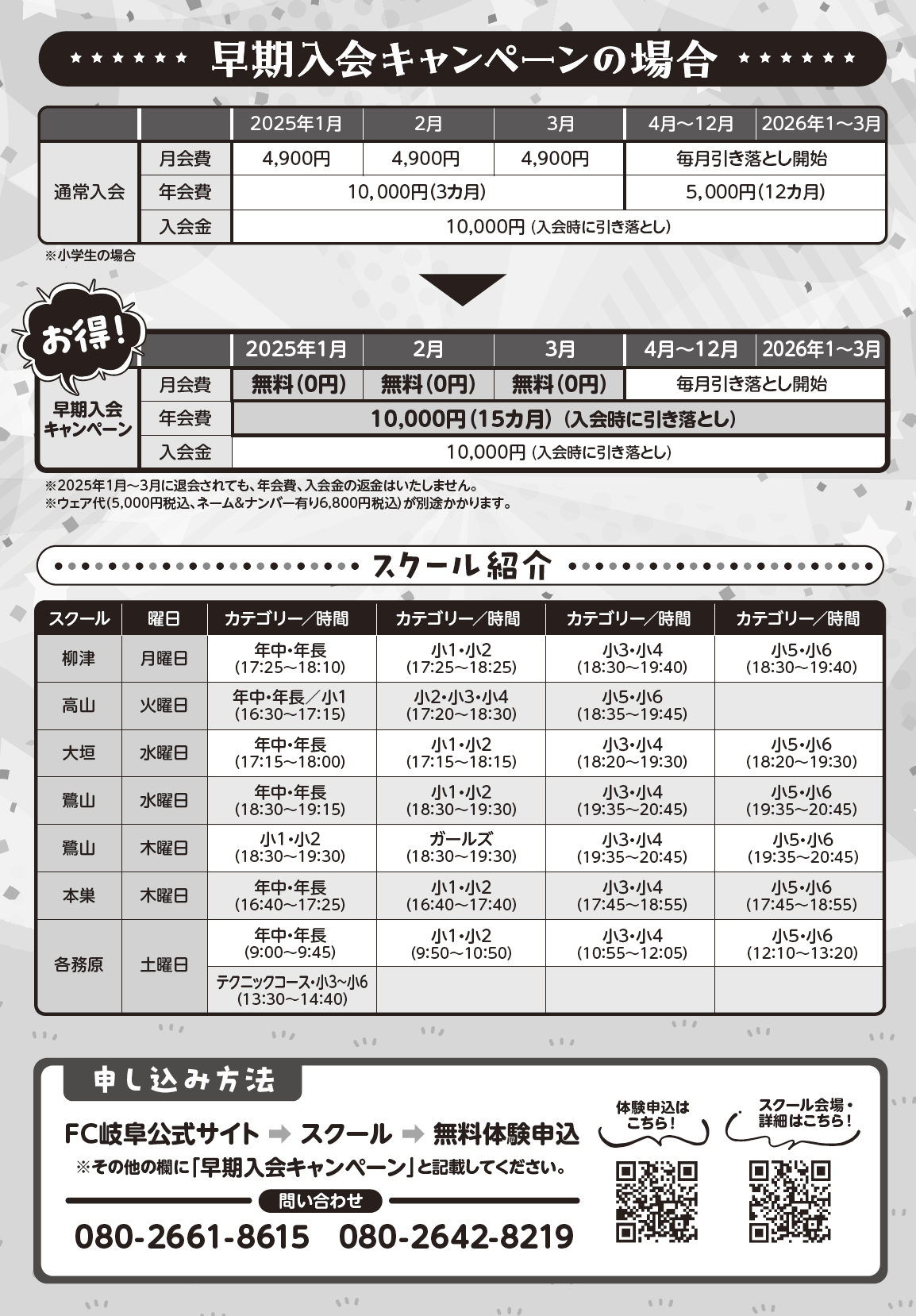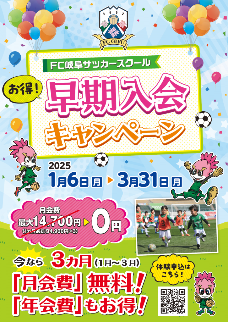FC岐阜サッカースクールでは、2025年に向けて「早期入会キャンペーン」(期間:2025年1月6日〜3月31日)を実施します。2025年1月から3月の月会費が無料になるだけでなく、年会費もお得になります。