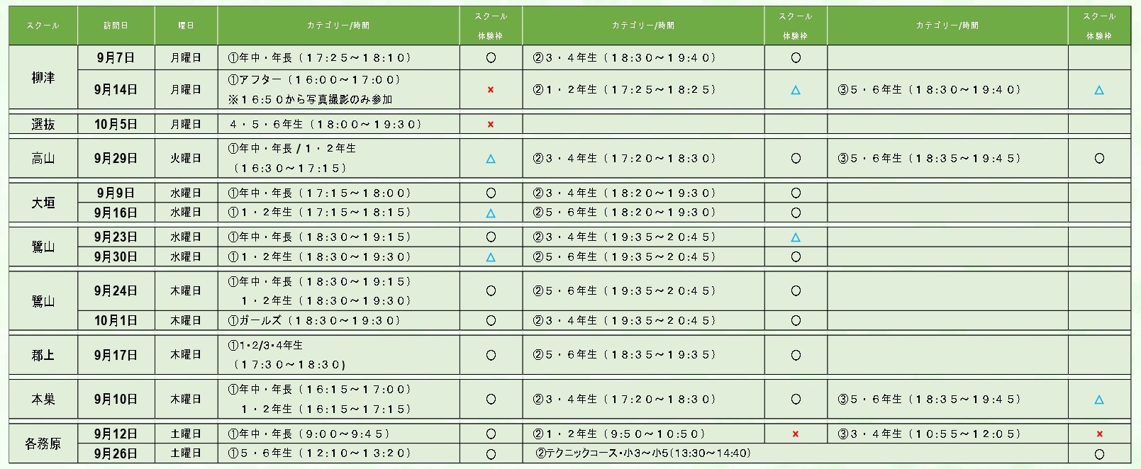 ・スクール体験枠(〇…体験有 △…残りわずか ×…体験無)