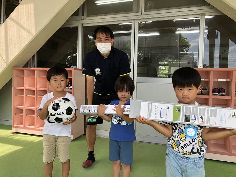 FC岐阜サッカースクールでは、7月下旬~8月下旬にかけて、昨年までにサッカー教室をさせていただいていた保育園・幼稚園を訪問し、折りたたみゴール1セットとサッカーボール2個を寄贈させて頂きました。