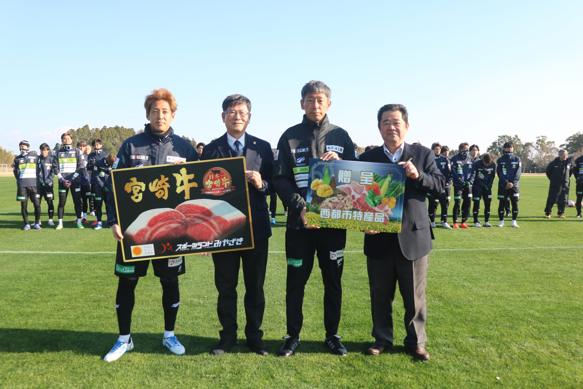西都市の橋田和実市長から直々に激励のお言葉を頂き、宮崎県観光協会の皆様からは宮崎牛を、Jリーグ等サッカー協力部会の皆様からは西都市産完熟フルーツの激励品を頂きました。