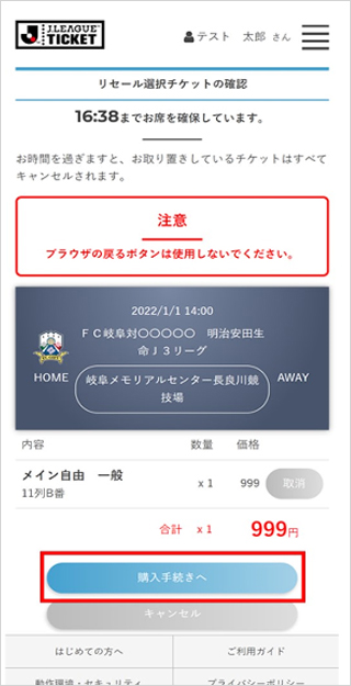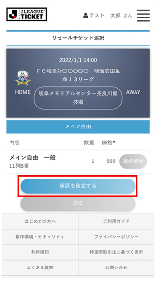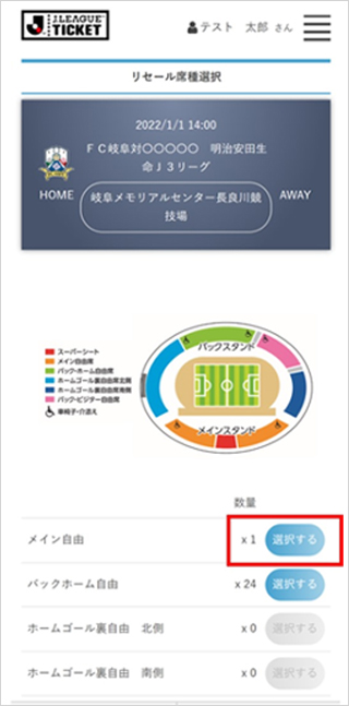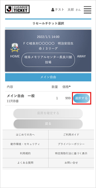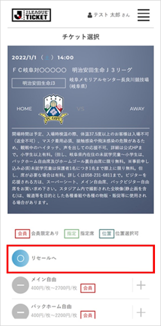 観戦希望の試合を選択し、チケット選択にて「リセール」をクリック。