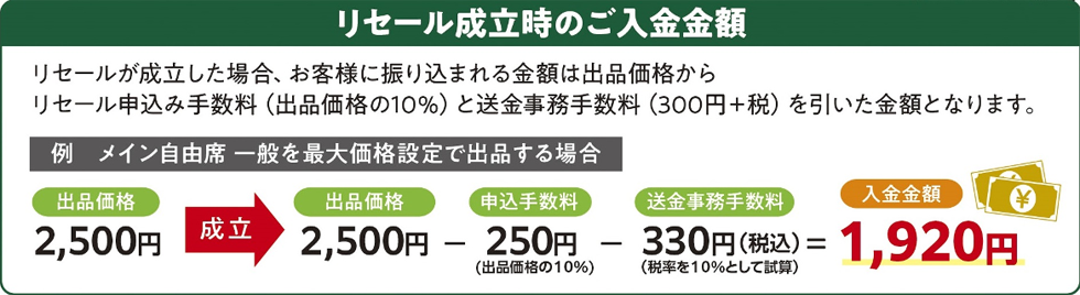 リセールされた試合の終了後2週間を目安にご登録された口座にお振込みさせていただきます。