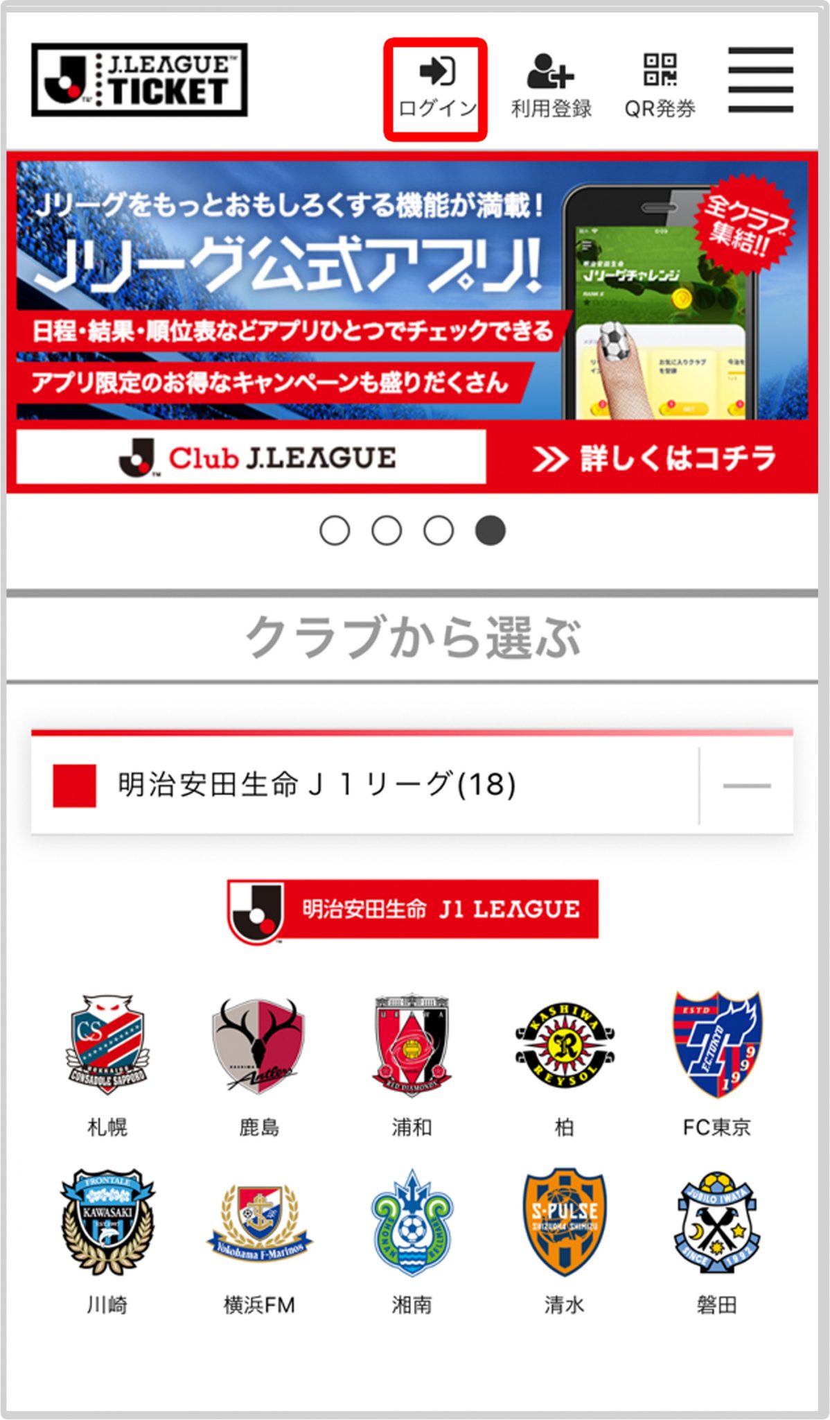 「Jリーグチケット」にアクセスし、右上の「ログイン」ボタンから「JリーグID」でログイン。