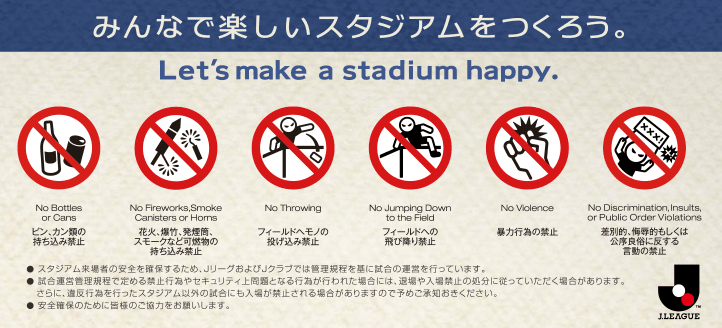 Jリーグでは、全クラブ共通のルールとマナーを設けています。スタジアムに訪れたファン・サポーター皆様が、気持ちよく楽しい時間を過ごせるように、ご理解とご協力をお願いします。