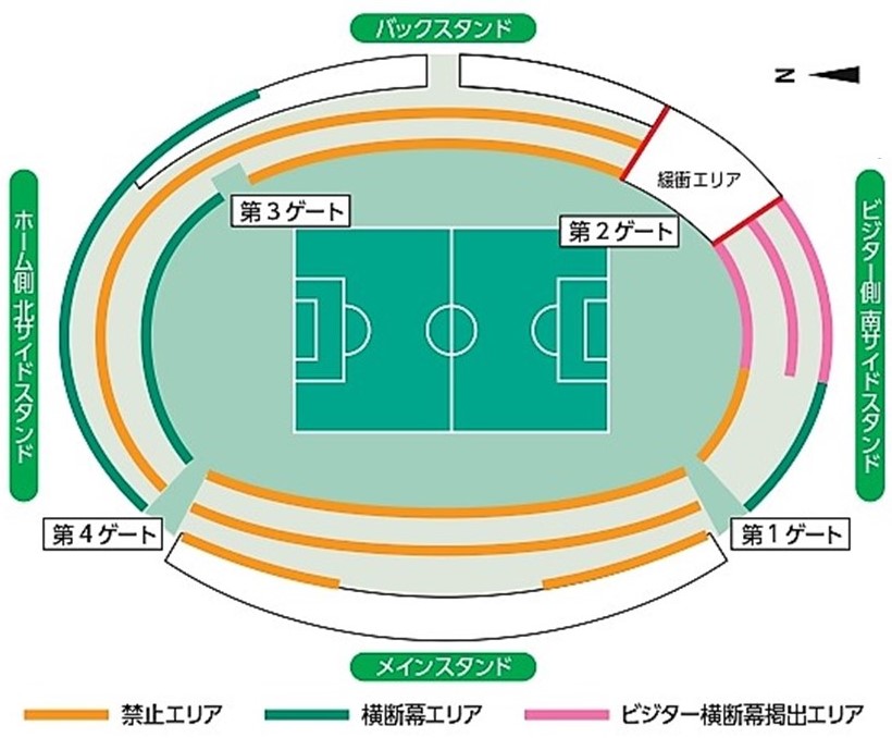 - ホーム観戦エリア(バック・ホーム自由席、ホームゴール裏自由席)でのビジターチームの応援、ビジタークラブグッズの着用観戦と一部通行はできません。